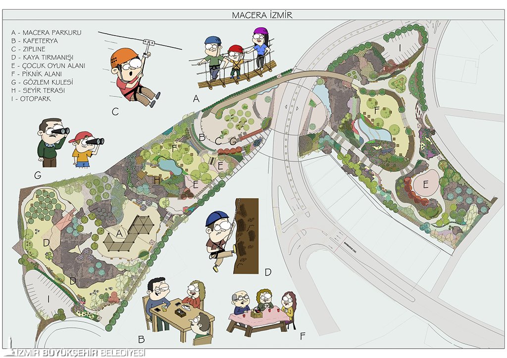 İzmir Büyükşehir Belediyesi, "Macera İzmir" projesini hazırlarken, her türlü ziyaretçi profilinin kullanımına açık olması, özellikle engelli, çocuk ve yaşlı ziyaretçilerin gereksinimlerine yönelik düzenlemeler içermesi ve kolay erişilebilirliğine özen gösterdi. Spor ve eğlencenin bir arada olabildiği aktivitelere olanak sağlaması hedeflenen proje, doğal dokuya zarar verilmeden, aksine dokuyu güçlendirecek şekilde hazırlandı. Alanının eğimli yapısı yüzünden yok olmaya yüz tutmuş ya da yok olmuş bitki örtüsünün yeniden canlandırıldığı bir proje olmasına da ayrıca dikkat edildi. “Macera İzmir”de topografik yapıyla uyumlu 1 adet gölet ve 3 adet süs havuzu de yer aldı. Alanın 19 bin m²’sine 361 ağaç, 36 bin çalı ve yer örtücü bitki dikimi yapıldı. Parka, 105 bin adet daha yer örtücü bitki ve çalı dikiminin gerçekleştirileceği bildirildi.