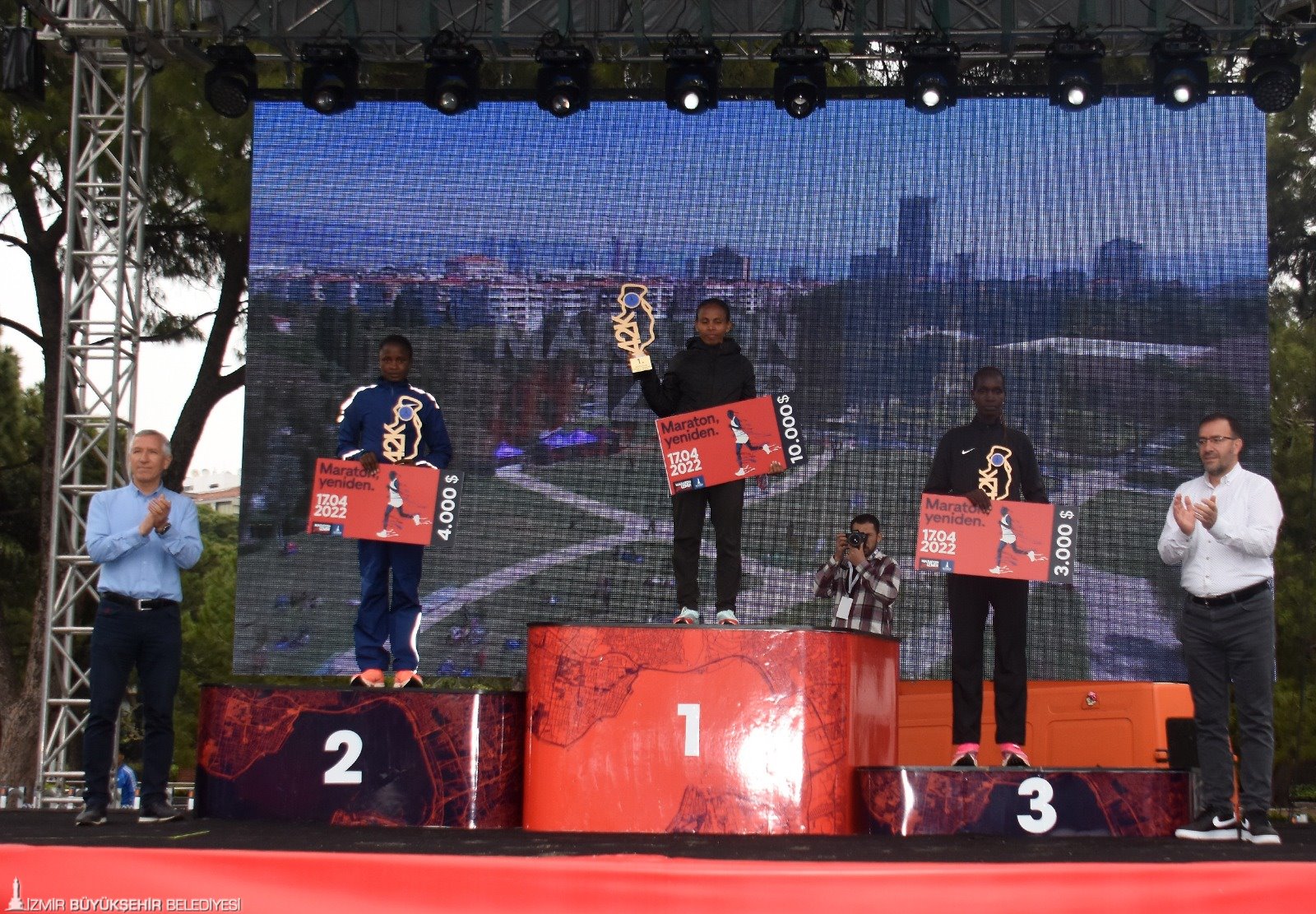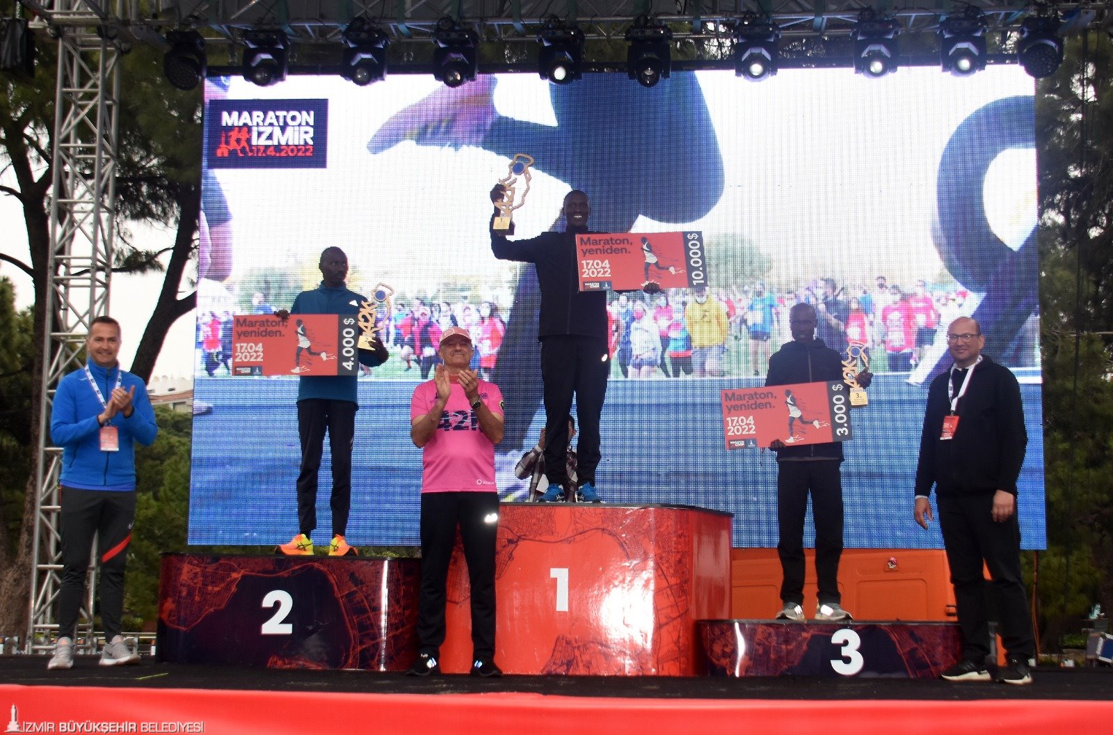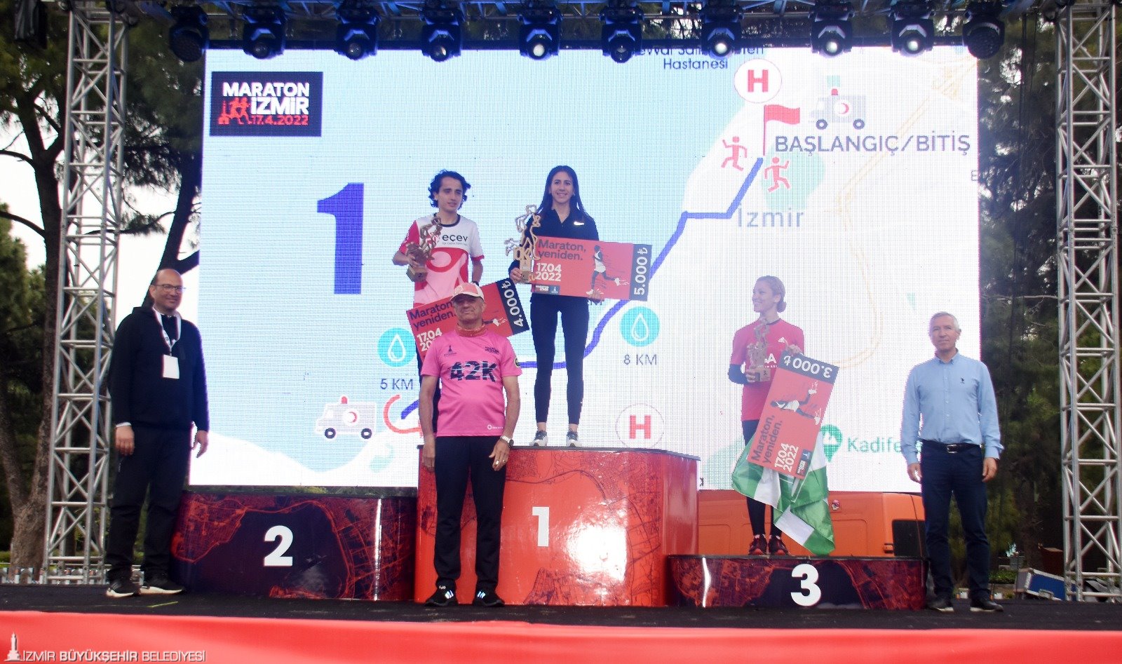 İzmir Büyükşehir Belediyesi’nin üçüncüsünü düzenlediği Maraton İzmir'de 42 km ve 10 km’de kürsüye çıkan atletlerin ödüllerini Atletizm Federasyonu Başkanı Fatih Çintimar, Yönetim Kurulu Üyeleri Nihat Bağcı ve Sercan Doğan, Genel Sekreter Satılmış Atmaca, İzmir Büyükşehir Belediyesi Genel Sekreter Yardımcısı Ertuğrul Tugay, Gençlik ve Spor Hizmetleri Dairesi Başkanı Hakan Orhunbilge ile İzmir Büyükşehir Belediyesi Gençlik ve Spor Kulübü Başkanı Ersan Odaman verdi.