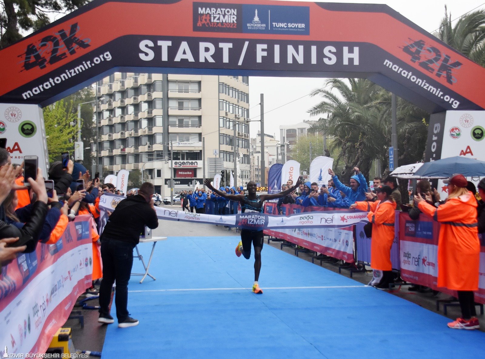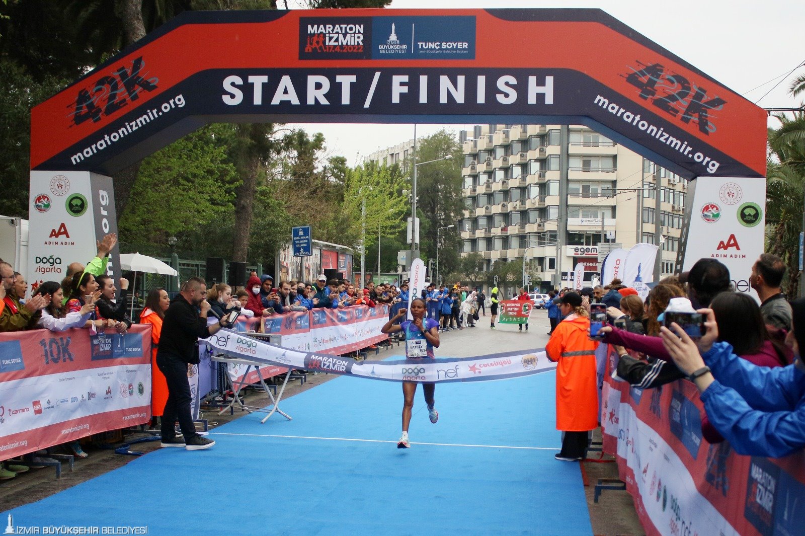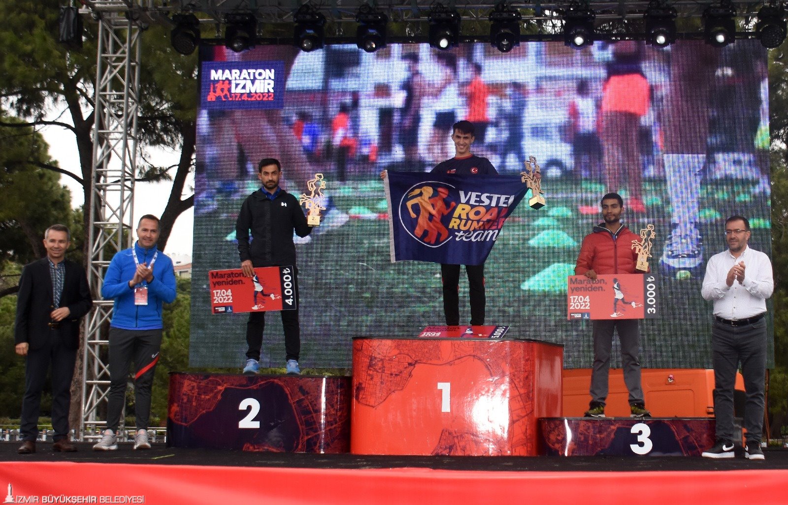 İzmir Büyükşehir Belediyesi’nin üçüncüsünü düzenlediği Maraton İzmir'de 42 km ve 10 km’de kürsüye çıkan atletlerin ödüllerini Atletizm Federasyonu Başkanı Fatih Çintimar, Yönetim Kurulu Üyeleri Nihat Bağcı ve Sercan Doğan, Genel Sekreter Satılmış Atmaca, İzmir Büyükşehir Belediyesi Genel Sekreter Yardımcısı Ertuğrul Tugay, Gençlik ve Spor Hizmetleri Dairesi Başkanı Hakan Orhunbilge ile İzmir Büyükşehir Belediyesi Gençlik ve Spor Kulübü Başkanı Ersan Odaman verdi.