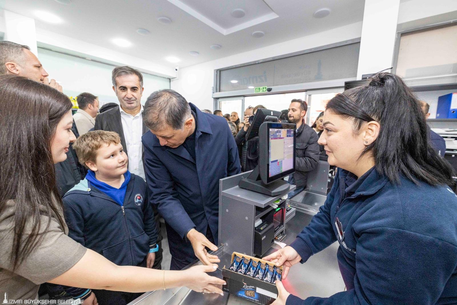 İzmir Büyükşehir Belediye Başkanı Dr. Cemil Tugay’ın kente kazandırdığı tanzim satış mağazaları İZMAR, iki yeni mağazayla kent genelinde yayılmaya devam ediyor. İzmir Büyükşehir Belediyesi’nin iştiraki İZTARIM AŞ tarafından, kaliteli ve uygun fiyatlı ürünleri aracısız şekilde halka ulaştıran İZMAR’ın 16’ncı ve 17’nci mağazaları hizmete açıldı. Yeni mağazalar; Karşıyaka Nergiz Mahallesi 1775 Sokak üzerinde ve Gaziemir Aktepe Mahallesi 120 Sokak ile 118/9 Sokak kesişiminde yer alıyor. Hane bütçelerine nefes aldırmayı amaçlayan İZMAR, bu yeni noktalarla daha fazla yurttaşa ulaşmayı hedefliyor. 200 metrekarelik geniş alanıyla Karşıyakalılara hizmet verecek Nergiz Mahallesi’ndeki mağazanın açılış törenine İzmir Büyükşehir Belediye Başkanı Dr. Cemil Tugay da katıldı. Kurdele kesiminin ardından marketten ilk alışverişi yapan Başkan Tugay, aldığı çikolataları yurttaşlara dağıttı.