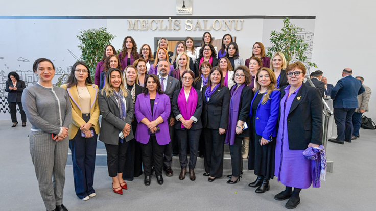 İzmir Büyükşehir Belediye Meclisi’nin CHP'li kadın meclis üyeleri, 8 Mart Dünya Emekçi Kadınlar Günü kapsamında basın açıklaması yaptı. Kadın meclis üyeleri adına konuşan CHP Grup Sözcüsü Elvin Sönmez Güler, siyasette var olmanın, yalnızca temsil edilmek olmadığını kaydederek “Siyasette var olmak, bu düzenin kurallarını değiştirmektir. Kadınlar siyasete girdiğinde siyaset değişir. Ezberler bozulur, adalet büyür, ses yükselir, gerçek demokrasi filizlenir. İşte bu yüzden her fırsatta önümüze yeni duvarlar örenler bilsinler ki, biz o duvarları yıkmaya geldik. Bu ülkenin geleceğini, bir avuç erkeğin kararlarına ya da onların gölgesinde alınan kararlara terk etmeyeceğiz. Belediyelerde, meclislerde, meydanlarda, sokaklarda kadınların sesi yükseldikçe, eşitliğin, adaletin ve özgürlüğün sesi yükselecek. Kadınlar durursa hayat durur; kadınlar kazanırsa herkes kazanır. İzmir Büyükşehir Belediyesi Meclisi’nin kadın üyeleri olarak buradan ilan ediyoruz; hiçbir yere gitmiyoruz. Siyaseti değiştireceğiz, hayatı değiştireceğiz, bu düzeni değiştireceğiz” diye konuştu.