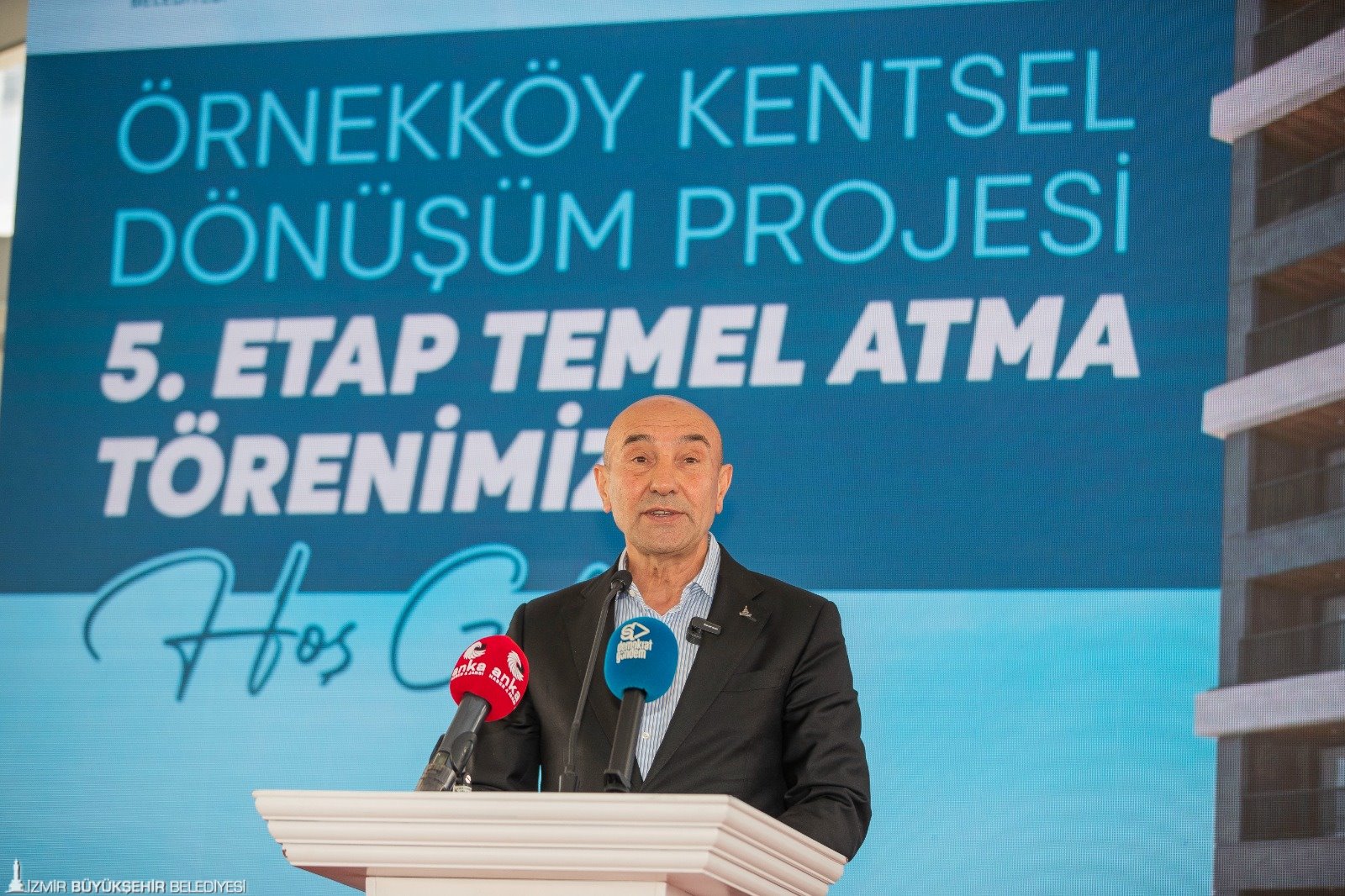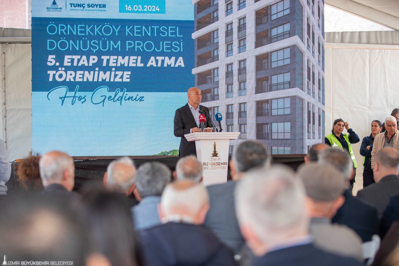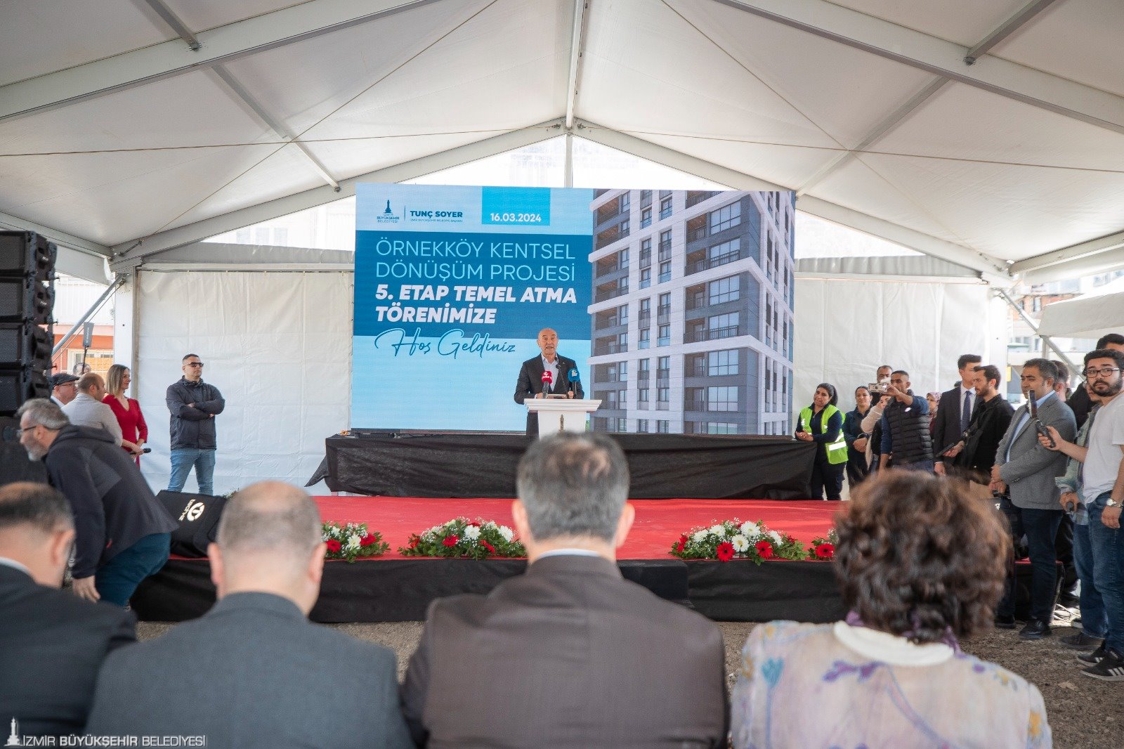 Temeli atılan 5. etap kapsamında 9 bin 61 metrekare arsa, 78 bin 500 metrekare inşaat alanında 585 bağımsız birim inşa edileceğini vurgulayan Başkan Soyer, “İzmir’in dirençli kent kimliğine yepyeni bir çehre kazandıracak bu devasa alanda, üç ayrı imar adasında, dört ayrı blok yer alacak. Bloklardan ilkinin kaba inşaat çalışmaları devam ediyor. İkincisinin temelini de bugün hep birlikte atıyoruz. Diğer iki blokumuzun yükseleceği alanda ise hafriyat çalışmalarımız sürüyor. Çok yakında temel beton dökülerek kaba inşaat çalışmalarımızı başlatacağız. Bu etapla birlikte Örnekköy'de kentsel dönüşümde yepyeni bir sayfa açıyoruz. Mahallemizi dirençli, güvenli ve doğasıyla uyumlu bir yaşam alanı haline getiriyoruz. Yıkılan her bina yerine depreme dayanıklı, yeşil alanları ve sosyal donatılarıyla zenginleştirilmiş yeni yapılar oluşturuyoruz. Bu dönüşümle birlikte, Örnekköy'ün sadece fiziki yapısını değil, aynı zamanda sosyal dokusunu da iyileştiriyoruz. Mahalle sakinlerimizin yaşam kalitesini yükseltiyoruz. Örnekköy’e, Karşıyaka ilçemize ve tüm İzmir’e hayırlı, uğurlu olsun” diye konuştu.
