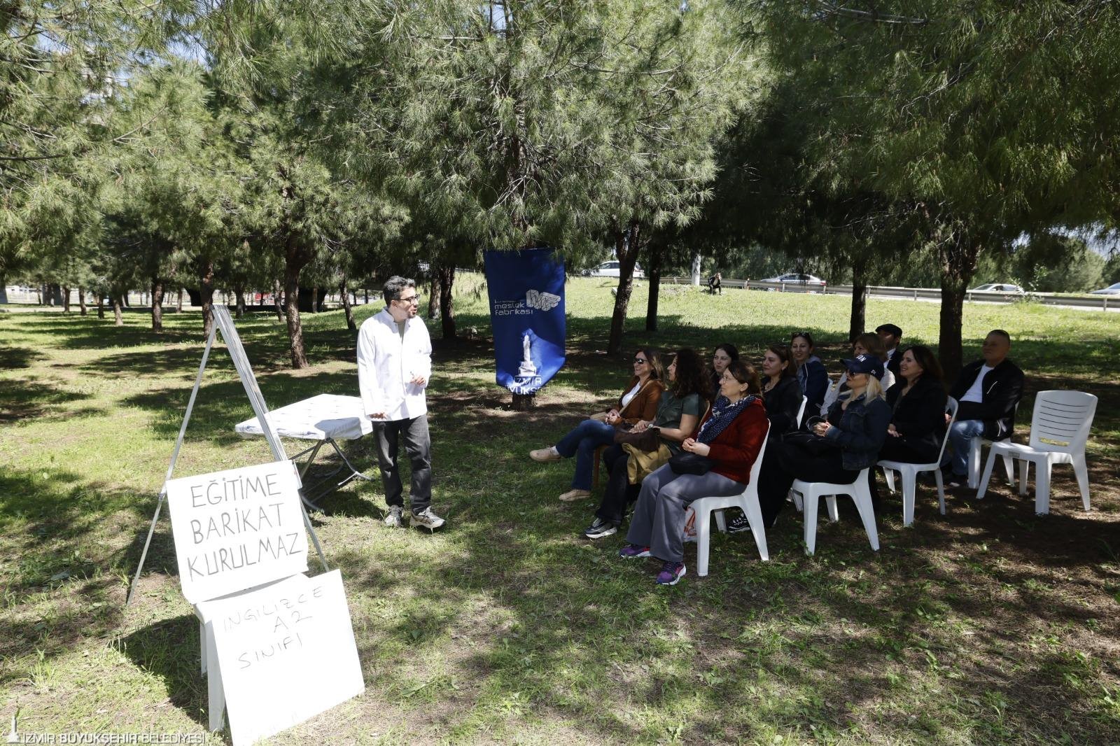 Mülkiyeti İzmir Büyükşehir Belediyesi’ne ait olan Meslek Fabrikası binasına Vakıflar Bölge Müdürlüğü tarafından el konulmasının ardından birçok mağduriyet yaşandı. Meslek Fabrikası’nın verdiği ücretsiz İngilizce kursuna katılan kursiyerler, binaya girişlerin polisler tarafından engellenmesi nedeniyle son derslerini fabrikanın karşısındaki çim alanda yapmak zorunda kaldı. Masa ve sandalyelerle sınıfa dönüştürülen bu alanda derslerini tamamlayan kursiyerler, sevinç ve üzüntüyü bir arada yaşadı.