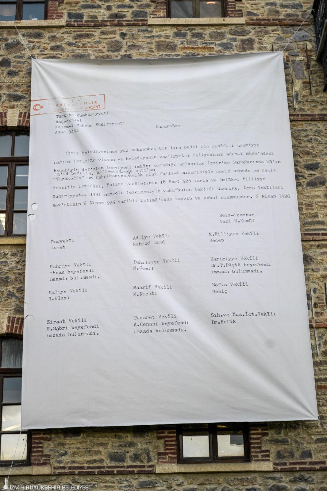 Uzun yıllardır Meslek Fabrikası olarak kentlilere hizmet veren İzmir Büyükşehir Belediyesi’nin mülkiyetindeki tarihi binaya Vakıflar Genel Müdürlüğü tarafından el konulması girişimine yönelik tepkiler sürüyor. Bir yandan hukuki yollara başvurarak İzmirlinin hakkını koruma mücadelesi veren Büyükşehir Belediyesi, haklılığının en güçlü kanıtlarından biri niteliğindeki belgenin görsellerini de dev posterler haline getirdi. Halkapınar’daki yapının belediyenin mülkiyetine geçişine ilişkin 1926 yılında Gazi Mustafa Kemal Atatürk’ün imzaladığı kararnamenin yer aldığı görseller yoldan geçenlerin okuyabileceği şekilde binanın duvarlarına asıldı.
