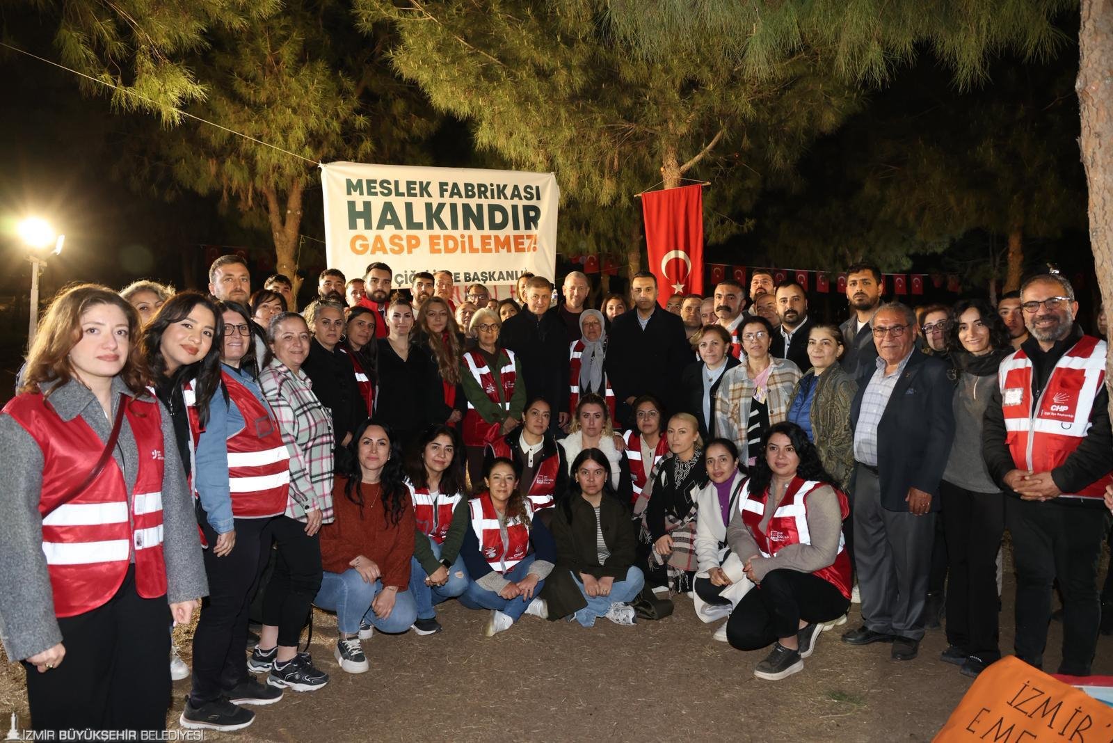 Mülkiyeti İzmir Büyükşehir Belediyesi’ne ait Meslek Fabrikası binasına, Vakıflar Genel Müdürlüğü tarafından el koyma işlemleri üzerine İzmir Büyükşehir Belediye Başkanı Dr. Cemil Tugay’ın başlattığı nöbette sekiz gün geride kaldı. Meslek Fabrikası önünde nöbet tutan Başkan Tugay’a, Çiğli Belediye Başkanı Onur Emrah Yıldız, CHP Çiğli, Aliağa örgütleri ile Alevi Bektaşi Dernekleri ile yurttaşlar destek verdi. Toplumun her kesimden büyük destek gördüklerini belirten İzmir Büyükşehir Belediye Başkanı Dr. Cemil Tugay, “Sonuç alana kadar vazgeçmeyeceğiz. Uzlaşı ile bu sorunu çözmek ve burayı yeniden halkımızın kullanımına sunmak istiyoruz” dedi. Nöbete katılan yurttaşlar, Meslek Fabrikası’nın halkın ortak değeri olduğunu, bu tür kamusal alanların korunması gerektiğine inandıklarını belirterek, Başkan Tugay'ın sonuna kadar yanında olacaklarını vurguladı.