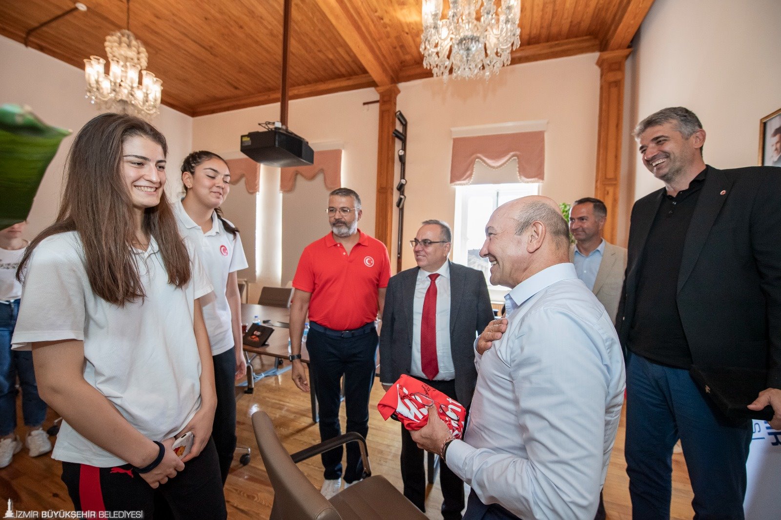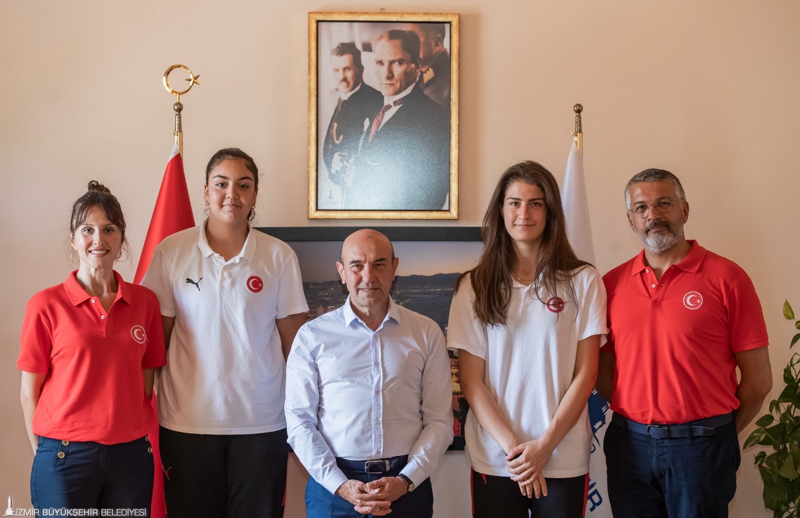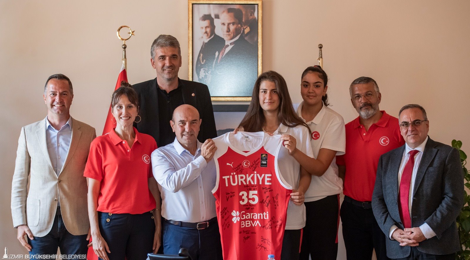 11-19 Ağustos 2023 tarihleri arasında İzmir'de düzenlenen 16 Yaş Altı Kızlar Avrupa Şampiyonası müsabakaları kapsamında 15 Ağustos Salı günü (yarın) Finlandiya ile maça çıkmaya hazırlanan milli takım oyuncuları İzmir Büyükşehir Belediye Başkanı Tunç Soyer’i ziyaret etti. Egemenlik Evi’nde yapılan toplantıya İzmir Büyükşehir Belediyesi Gençlik ve Spor Dairesi Başkanı Hakan Orhunbilge, ESHOT Genel Müdürü Erhan Bey, Türkiye Basketbol Federasyon As Başkanı Hüseyin Beşok, 16 Yaş Altı Kızlar Milli Takım Baş Antrenörü Olcay Orak, Takım Kaptanı Şeyma Yılık, Takım Menajeri Ceyda Kozluca Kabaran ve oyuncu Berfin Şahin katıldı. Takım kaptanı Şeyma Yılık, oyuncuların imzaladığı formayı günün anısına Başkan Soyer’e verdi.