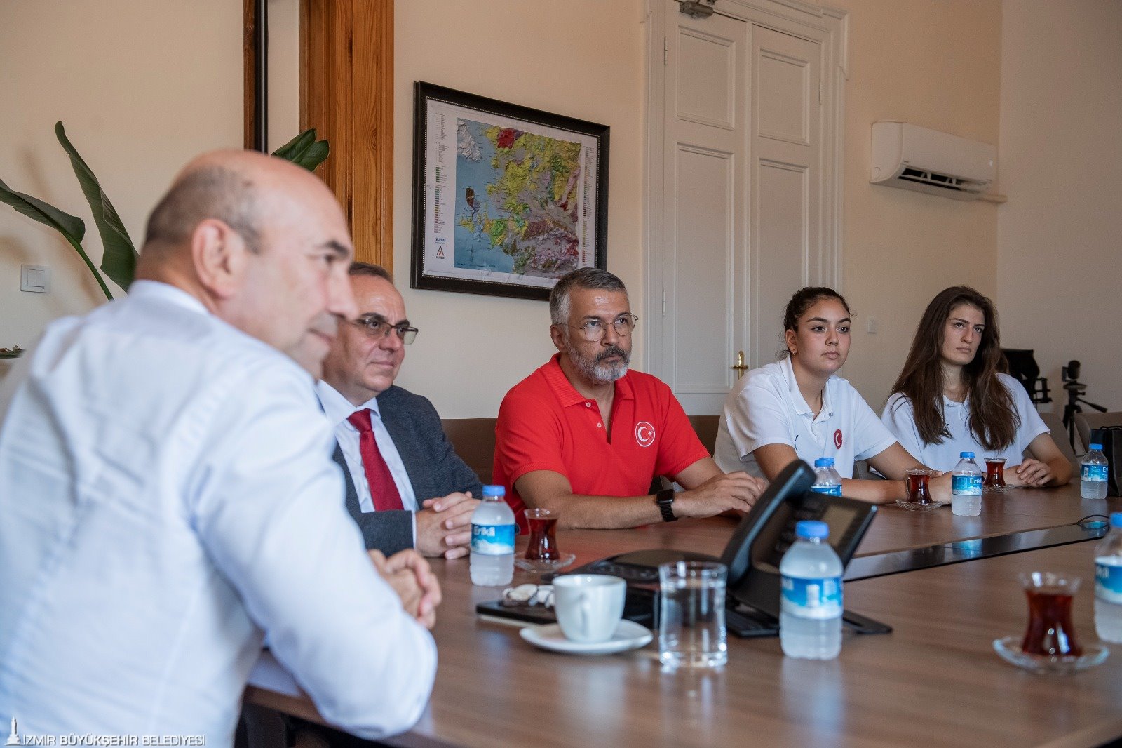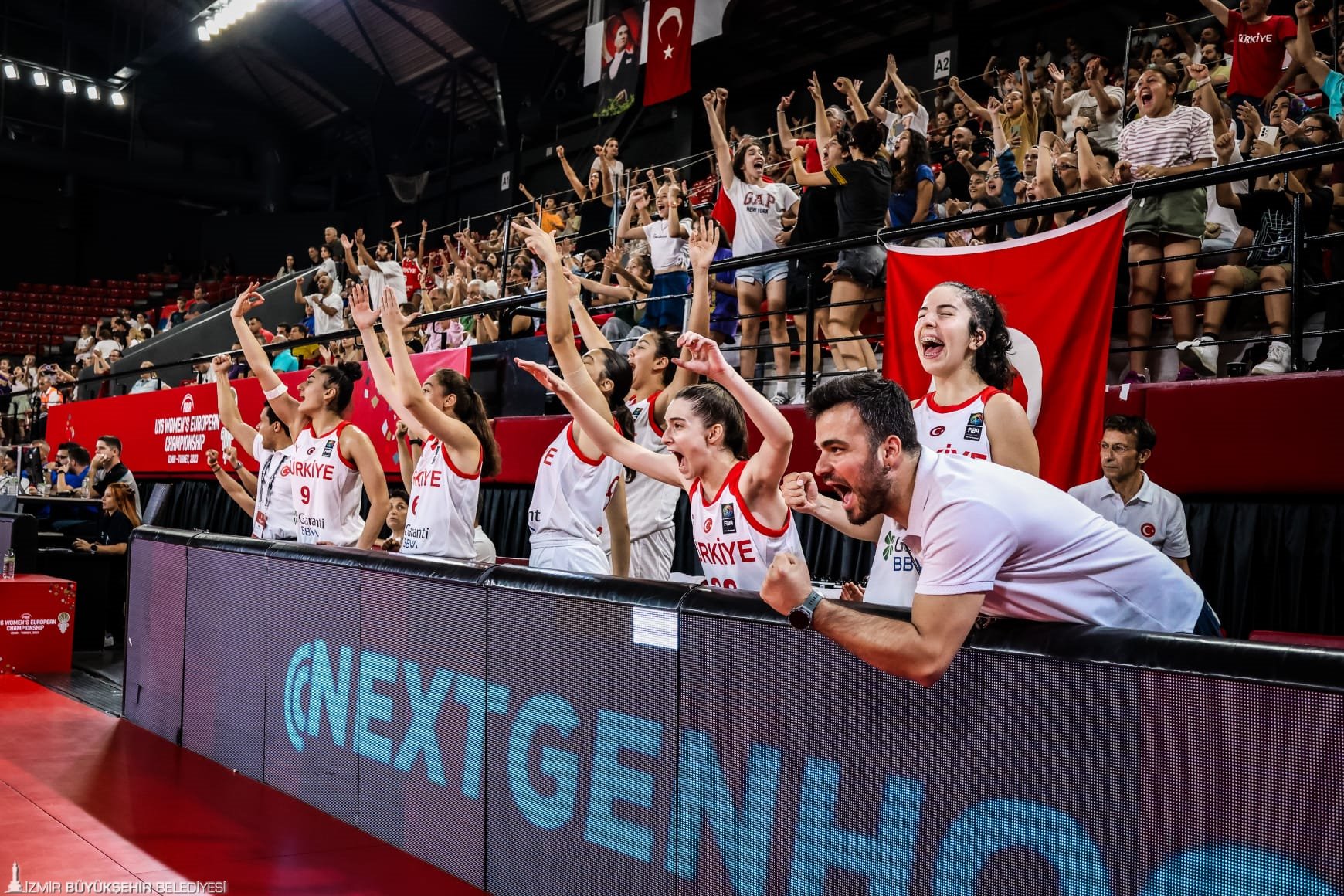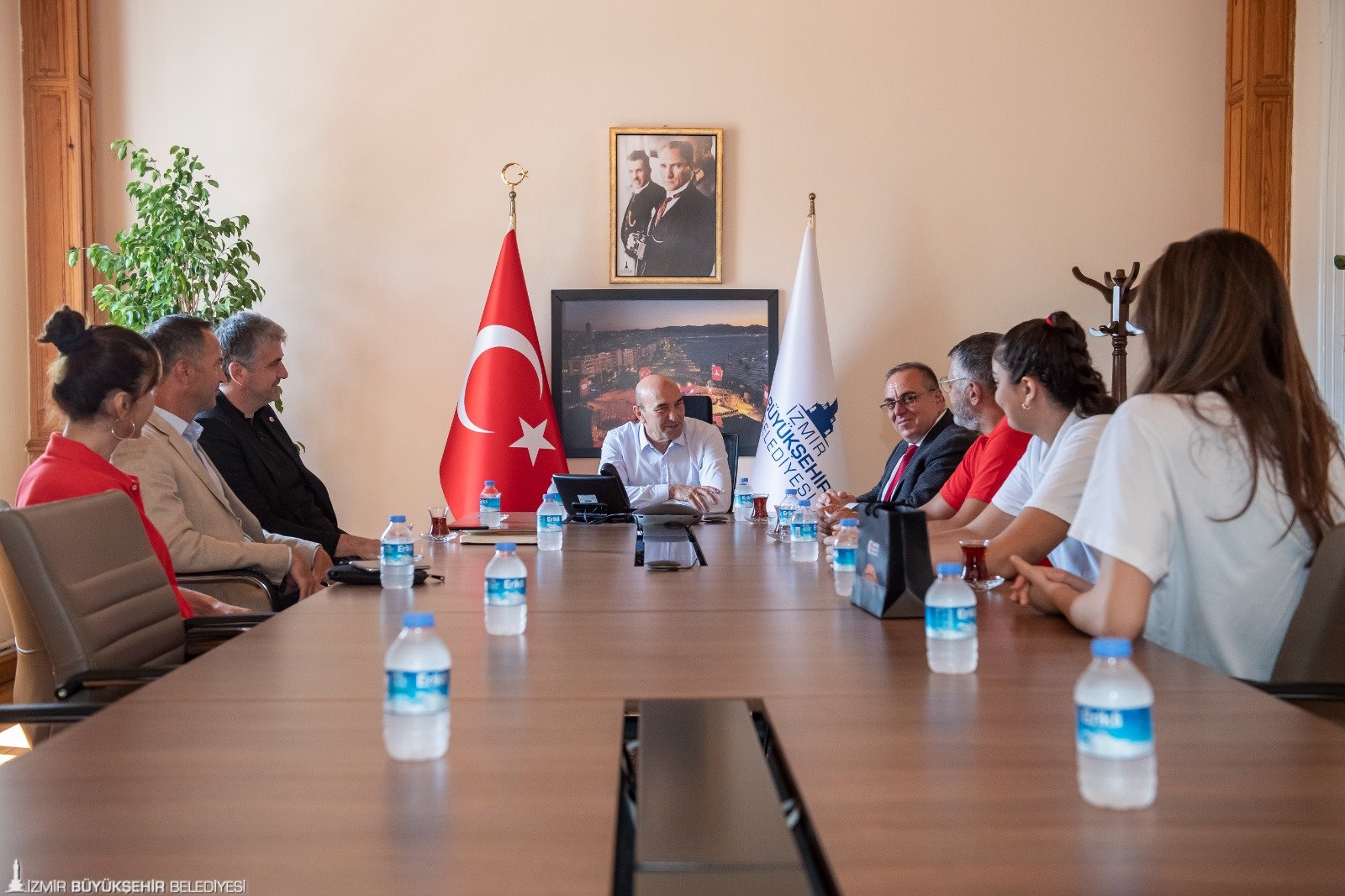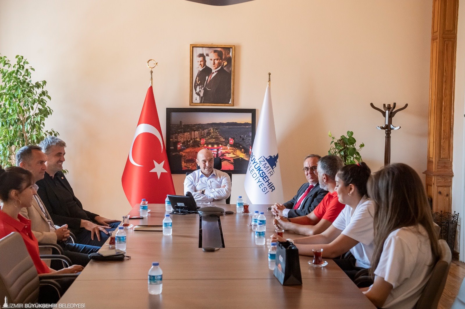 11-19 Ağustos 2023 tarihleri arasında İzmir'de düzenlenen 16 Yaş Altı Kızlar Avrupa Şampiyonası müsabakaları kapsamında 15 Ağustos Salı günü (yarın) Finlandiya ile maça çıkmaya hazırlanan milli takım oyuncuları İzmir Büyükşehir Belediye Başkanı Tunç Soyer’i ziyaret etti. Egemenlik Evi’nde yapılan toplantıya İzmir Büyükşehir Belediyesi Gençlik ve Spor Dairesi Başkanı Hakan Orhunbilge, ESHOT Genel Müdürü Erhan Bey, Türkiye Basketbol Federasyon As Başkanı Hüseyin Beşok, 16 Yaş Altı Kızlar Milli Takım Baş Antrenörü Olcay Orak, Takım Kaptanı Şeyma Yılık, Takım Menajeri Ceyda Kozluca Kabaran ve oyuncu Berfin Şahin katıldı. Takım kaptanı Şeyma Yılık, oyuncuların imzaladığı formayı günün anısına Başkan Soyer’e verdi.