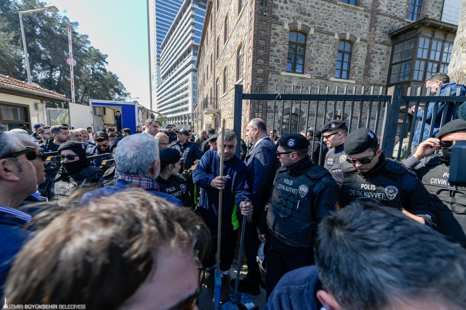 Bina önünde ve bahçesinde gergin anlar yaşandı. Çevik Kuvvet ekipleri tahliye işlemleri yapmak amacıyla binayı boşaltma girişiminde bulundu. İzmir Milletvekili Ednan Arslan, Vakıflar Bölge Müdürü Tahir Emre Can ve emniyet yetkilileri ile görüştü. Meslek Fabrikası önüne gelen işçiler ve yurttaşlar tahliyeye tepki gösterdi. Çevik Kuvvet milletvekilleri dahil tüm kalabalığı dışarıya çıkardı. CHP İzmir İl Başkan Vekili Murat Aydın, DEM Parti İzmir Milletvekili İbrahim Akın, İzmir Büyükşehir Belediyesi Genel Sekreteri Zeki Yıldırım, genel sekreter yardımcıları da alanda yer aldı.