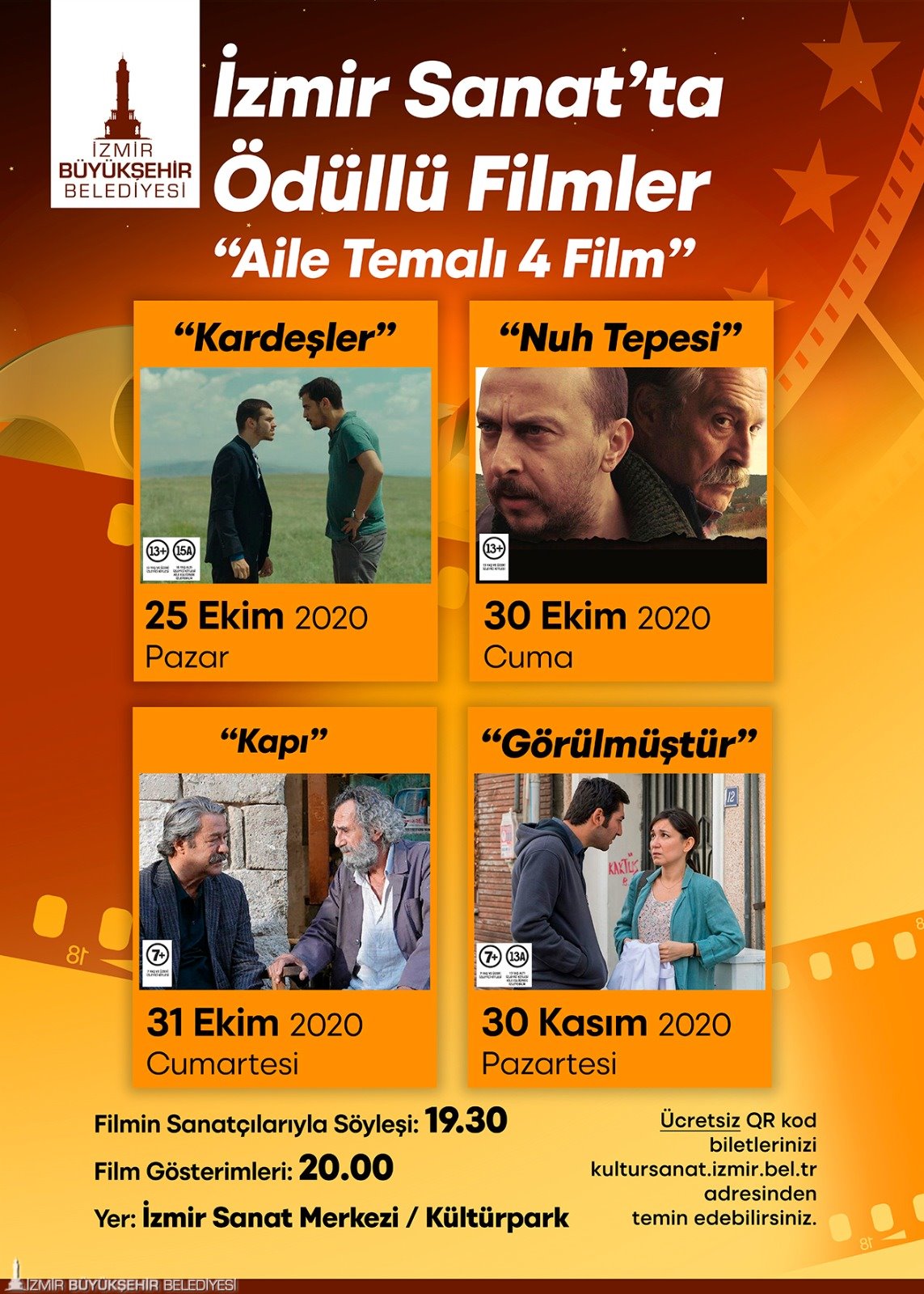 İzmir Büyükşehir Belediyesi sonbaharda ödüllü filmleri ağırlıyor. “Aile” temalı dört filmin gösterileceği ücretsiz etkinlikler dizisi 25 Ekim’de “Kardeşler” filmiyle başlayacak. Gösterimler Kültürpark İzmir Sanat’ta 20.00’de yapılacak. Her gösterimden önce sinema yazarı Vecdi Sayar ise filmlerin yönetmenleri ve oyuncularıyla söyleşi yapacak. Söyleşilerin başlangıç saati ise 19.30’da olacak. Etkinlikler pandemi önlemleri altında yapılacak.