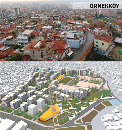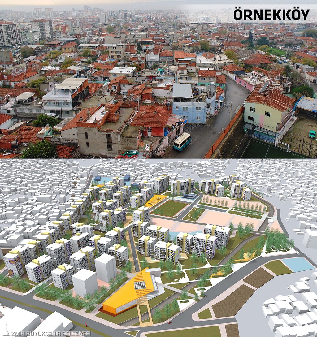 İzmir Büyükşehir Belediyesi, Örnekköy'deki kentsel dönüşümün 1. Etap yapım ihalesini 5 Ocak 2018'de tamamladı. Ardından kısa süre içinde inşaat çalışmalarına başlandı. Yıpranmış, sağlıksız ve kaçak yapılardan oluşan Örnekköy proje alanında, 705 adet yapı ve 91 adet işyeri olmak üzere 1291 bağımsız birim bulunuyor. Toplam 3520 konut ve 338 adet işyerinin inşa edileceği proje alanında 60 m² (1+1) ,70 m² (2+1), 83 m² (2+1), 96 m² (2+1), 108 m² (3+1) ve 123 m² (3+1) olmak üzere 6 ayrı konut tipi tasarlandı. Proje bölgesinde 30 bin m² yeşil alan ve rekreasyon alanı, 10 bin m² semt spor alanı, içinde kapalı pazar yeri ve sosyal merkez bulunan 3 bin 500 m² Belediye Hizmet Alanı ile birlikte yaklaşık 4 bin m² büyüklüğünde 3 meydan bulunuyor. Ayrıca otopark ihtiyacı için açık ve kapalı otoparklar tasarlandı. Daha önceki imar planında ayrı yerlerde bulunan 1 adet ilkokul ve 1 adet ortaokul da tek bir yerde toplanarak toplam 15.000 m² büyüklüğünde bir eğitim alanı olarak planlandı.