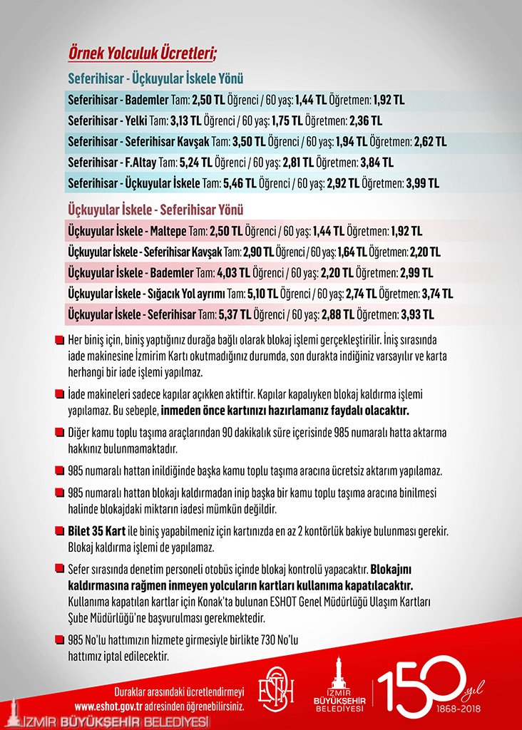 Hattın tamamında yapılacak yolculuğun tam bilet için 5.37 TL olarak kalacağı 985 No'lu Üçkuyular İskele-Seferihisar hattının ücret tarifesi şu şekilde uygulanacak: