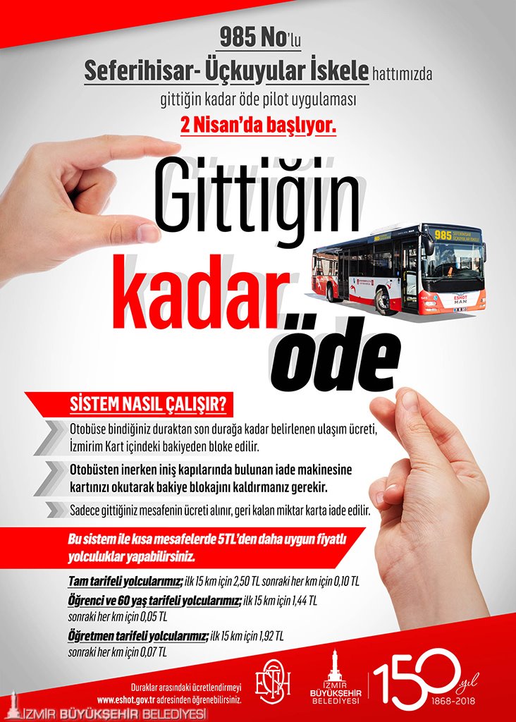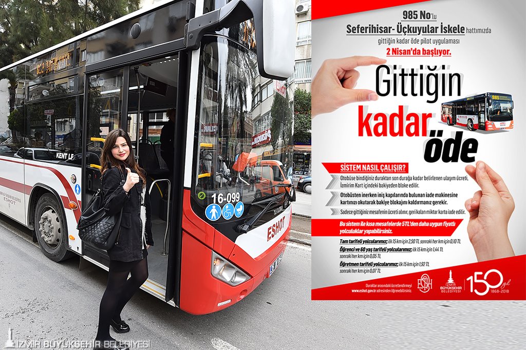 Toplu taşımanın cazibesini arttırmayı hedefleyen İzmir Büyükşehir Belediyesi, ESHOT Genel Müdürlüğü'nün ilçe tarifesinin uygulandığı uzun mesafeli hatlarda yeni bir sisteme geçiyor. İlk etapta 985 No'lu Seferihisar-Üçkuyular İskele hattındaki yolcuların gittiği kadar ücret ödeyeceği ve kısa mesafe yolculuk yapanların daha az ucuza seyahat edebileceği sistem 2 Nisan Pazartesi günü devreye giriyor. Mevcut durumda ilçe tarifesinin geçerli olduğu ve 5 liralık ücret kesilen binişlerde yeni sistemle birlikte gidilmeyen mesafenin ücreti yolculara iade edilecek. Böylece kısa mesafeli yolculuk yapanlar "daha ucuza" gitmiş olacak.
