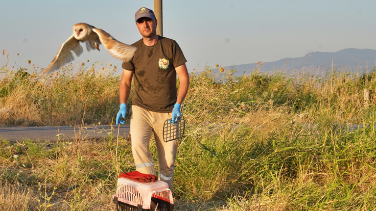 Taşıma kafesine konularak Menemen Tuzçullu Mahallesi yakınlarına getirilen baykuşlar günbatımında doğaya bırakıldı.