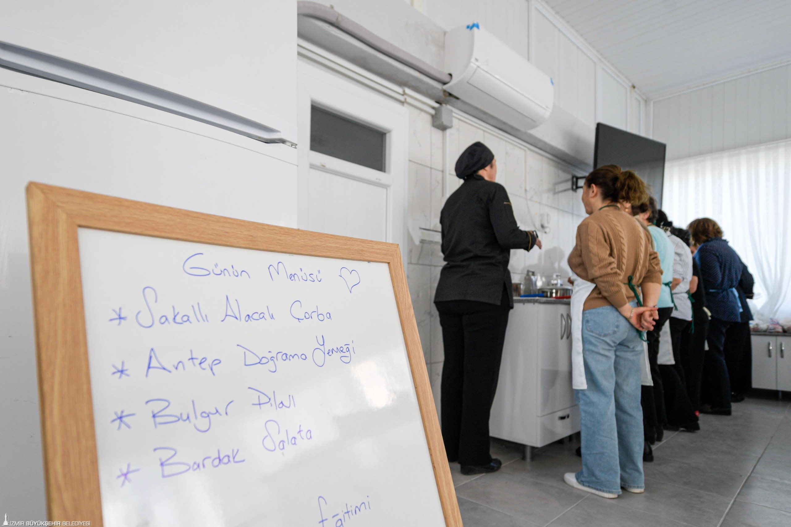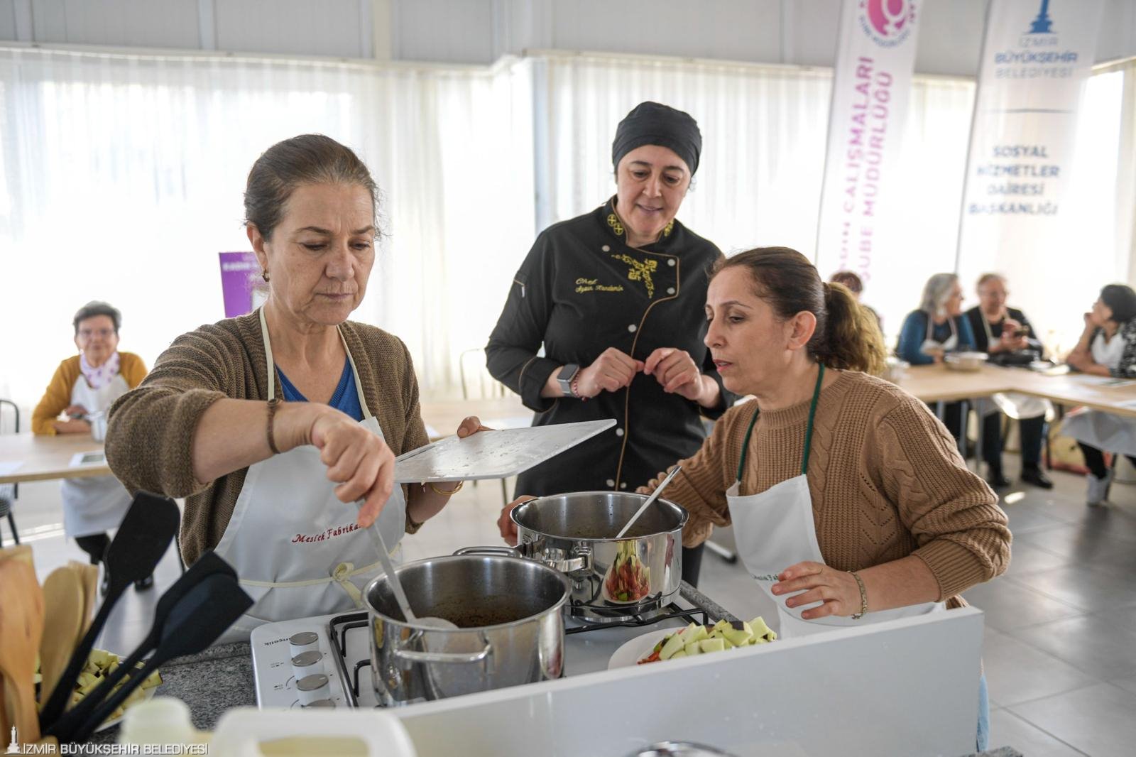 Aşevleri Şube Müdürlüğü’nde görevli gıda mühendisi Melisa Müldür, “Burası, dayanışmanın bir örneği. Bizler de gıda mühendisleri olarak yemeklerin sağlıklı koşullarda, sağlıklı hammadde ile uygun pişirme koşullarında üretilmesi ve evlere doğru şekilde muhafaza edilerek götürülmesi için buradayız. Yemek pişirme öncesinde ve pişirilme aşamasında biz de burada olacağız. Aşevleri Şube Müdürlüğü olarak yemeklerin hammaddelerini biz temin edeceğiz. Kadınlar da yemeklerini yaparak sağlıklı koşullarda evlerine götürecek” diye konuştu. Projede Meslek Fabrikası’nda yiyecek ve içecek alanlarında eğitmen olarak görev yapan personel de kadınlarla birlikte menü oluşturarak pişirme süresi boyunca onlara eşlik ediyor.
