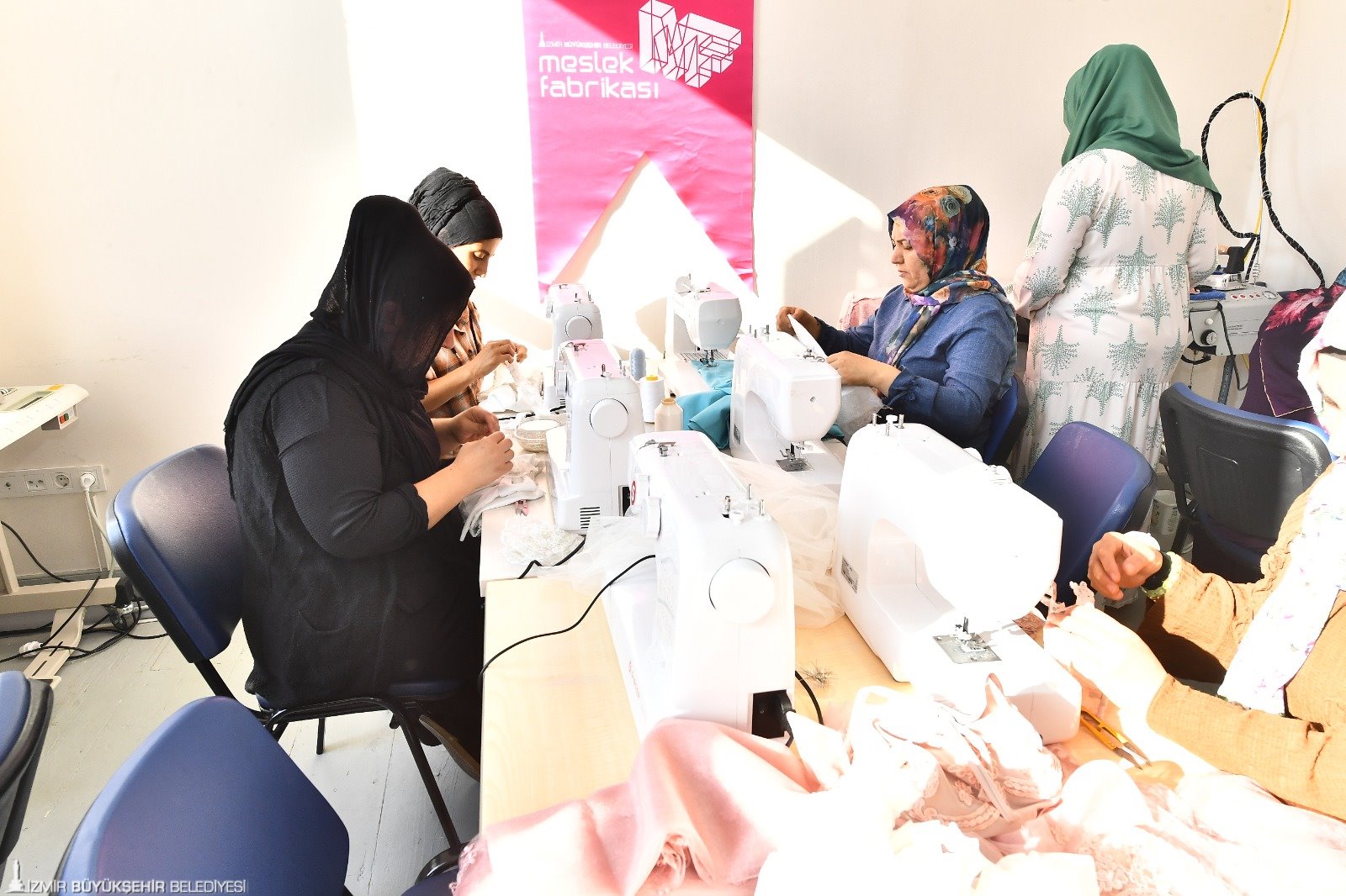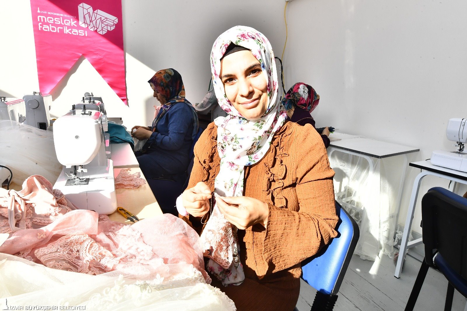 İzmir Büyükşehir Belediyesi’nin kente kazandırdığı Sakin Mekân Agora, kentteki sivil toplum örgütleriyle birlikte kadınların, çocukların ve gençlerin kullanımına sunuldu. Yaklaşık 5 aydır faaliyet gösteren mekanda kadınlar hem Meslek Fabrikası’nın eğitim programı kapsamında geliştirilen Altın İğne projesiyle iş sahibi olabiliyor, hem de ister dikiş-nakış isterse kuaförlük kursuna kayıt olup meslek edinebiliyor.