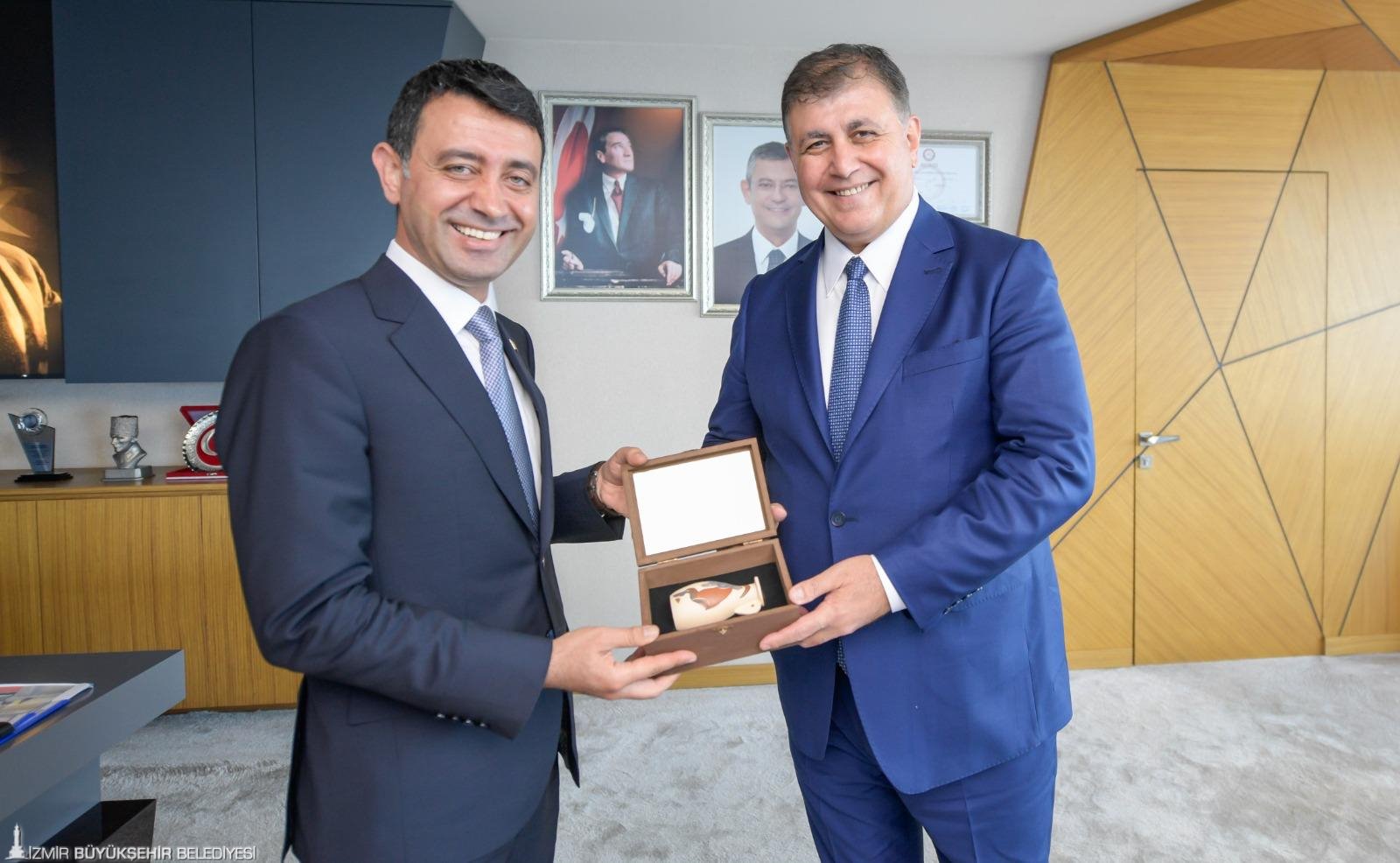 Programın ardından Önal, Başkan Tugay’a, Bayraklı’da yapılan kazılar sonucu elde edilen arkeolojik buluntulardan esinlenerek seramik sanatçısı tarafından yapılan, M.Ö 6. yüzyılda koku, parfüm, gül yağı, ilaç şişesi olarak kullanılan alabastron (vazo) hediye etti.