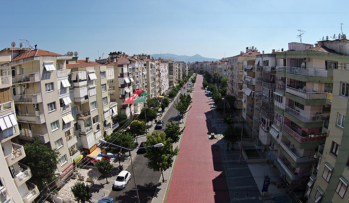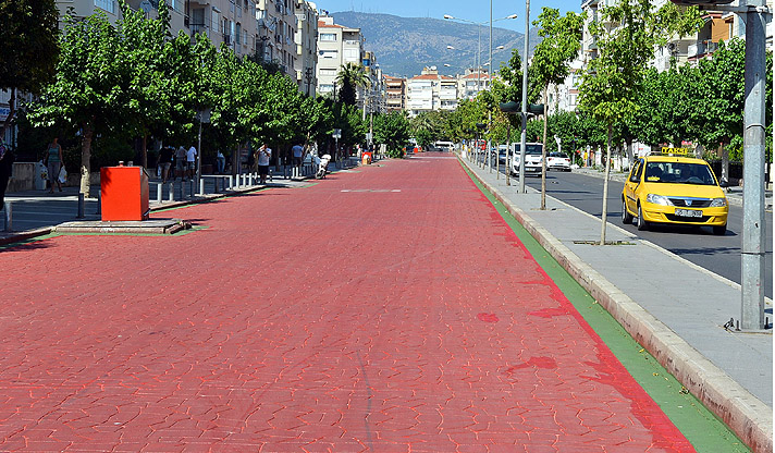 İzmir Büyükşehir Belediyesi, Bostanlı’nın işlek bulvarlarından biri olan Şehitler Bulvarı’nda renkli desenli asfalt uygulamasına başladı. 700 metre uzunluğunda, 20 metre genişliğindeki bölünmüş yolun tren yolundan sahile doğru olan kısmında yürütülen çalışmalarda, yol kenarlarında yeşil, yol gövdesinde ise kırmızı asfalt kullanıldı ve yola kayrak taşı deseni verildi.
