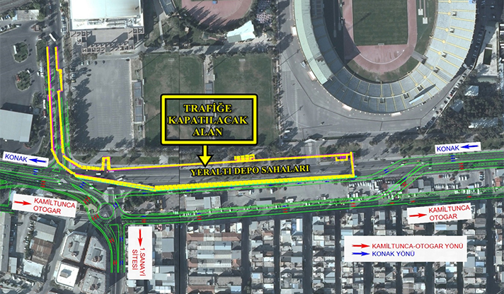 İzmir Büyükşehir Belediyesi Raylı Sistem Şube Müdürlüğü, satın alınan 95 adet metro aracı için gerekli olan Halkapınar Yeraltı Depolama Tesisi’nin devam eden yapım çalışmaları nedeniyle, Atatürk Spor Kompleksi önündeki Şehitler Caddesi’nde trafik akışında değişiklik yapılacağını duyurdu.