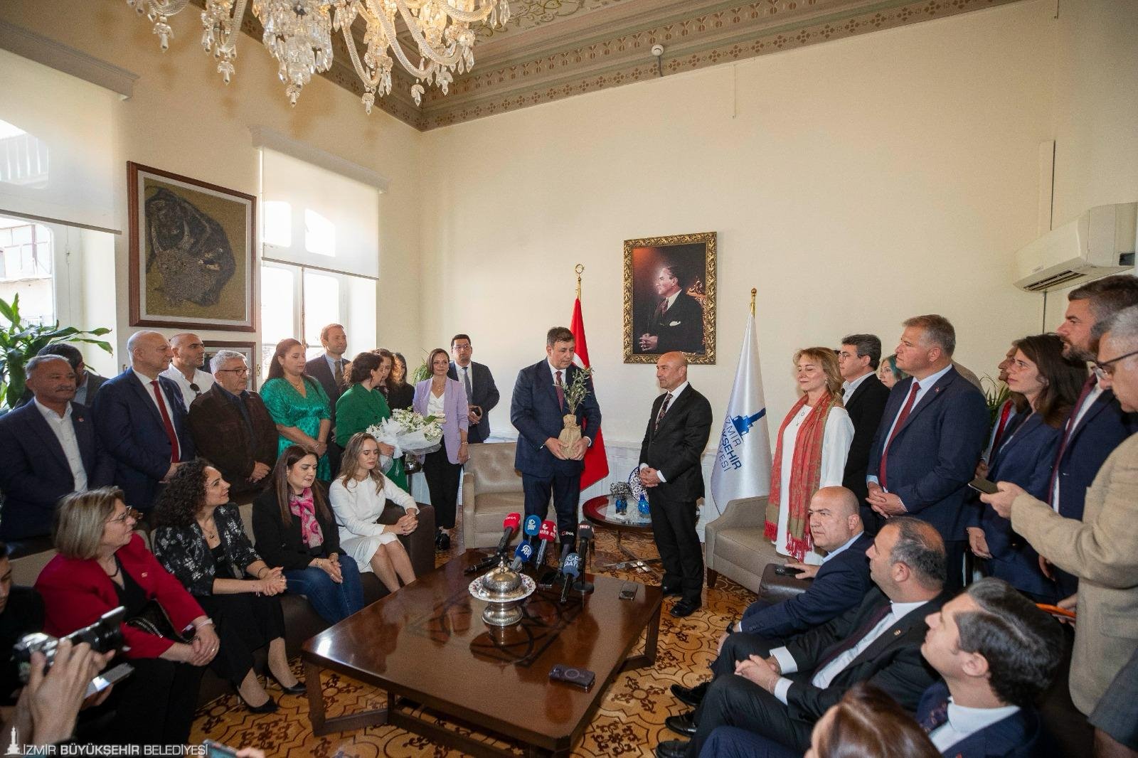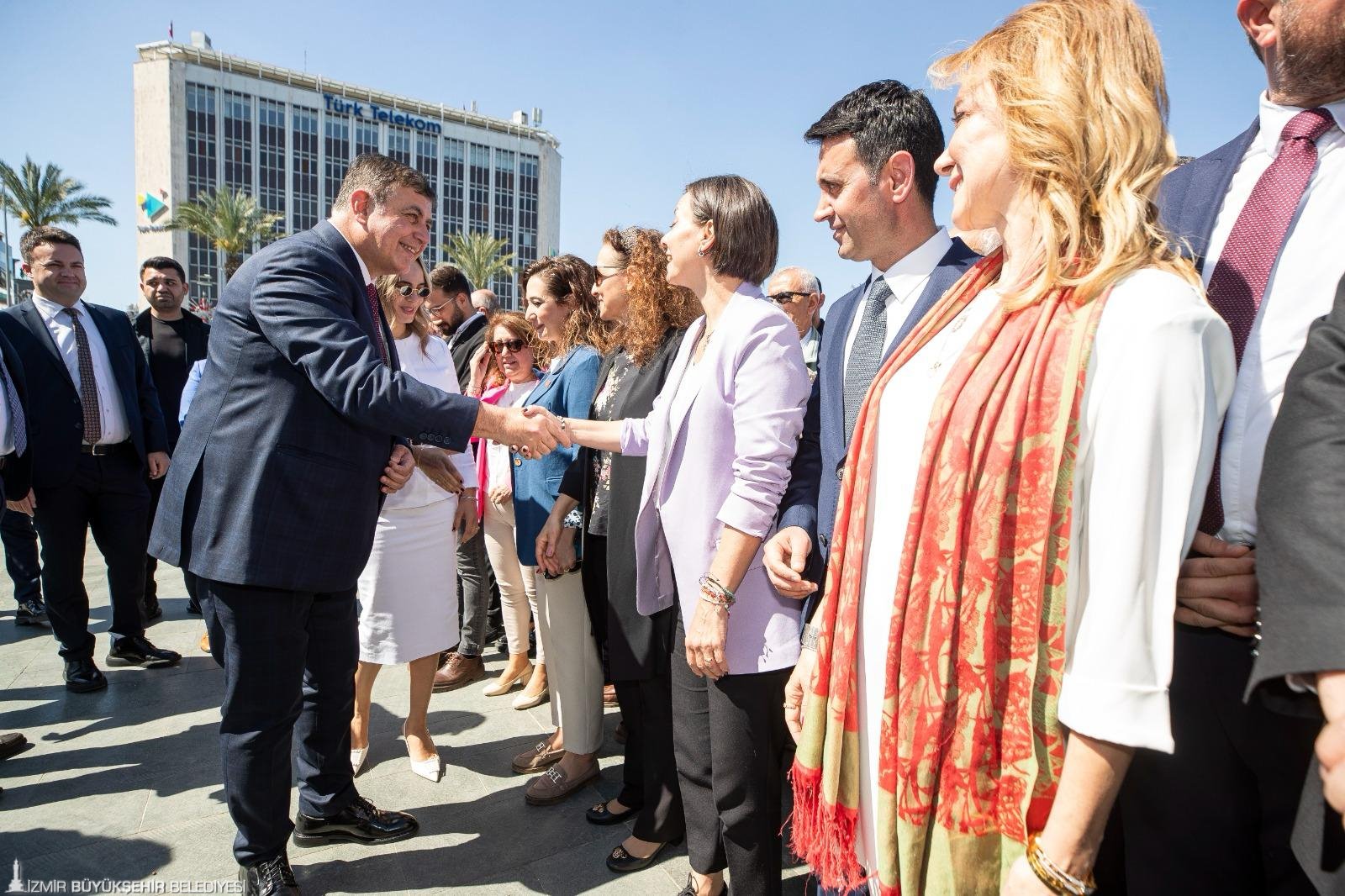 31 Mart tarihinde yapılan Mahalli İdareler Genel Seçimleri'nde İzmir Büyükşehir Belediye Başkanı seçilen ve mazbatasını alarak göreve başlayan Dr. Cemil Tugay bugün Tunç Soyer ile devir- teslim töreninde buluştu. Devir -teslim töreni öncesi Başkan Tugay Cumhuriyet Meydanı'nda düzenlenen programa katılarak Atatürk Anıtı'na çelenk bıraktı. Törene CHP İzmir Milletvekili Ednan Arslan, ilçe belediye başkanları, CHP örgütü, Başkan Tugay'ın eşi Öznur Tugay, İzmir Büyükşehir Belediyesi bürokratları ile yurttaşlar katıldı. Saygı duruşunda bulunulması ve İstiklal Marşı'nın okunmasının ardından Başkan Tugay, bu güzel anı paylaşan herkese teşekkür ederek konuşmasına başladı. Geçen son bir iki ayın zor anlarla dolu olduğuna dikkat çeken Başkan Tugay, “Özellikle Mayıs genel seçimlerinden sonra, ülkemizde artık bir şeylerin düzelme ihtimali kalmadığına dair üzüntünün yaygın olduğuna dair düşünceler vardı. 31 Mart yerel seçimleri, insanların umutsuz olduğu o aylardan sonra gelen bir seçim oldu. Çok mücadele ettik. Halkımıza kulak verdik. Halkın bizlerden beklediklerine kulak vererek, onlarla kucaklaşmaya, onlarla duyguda, düşüncede, hedefte birlikte olduğumuzu ifade etmeye çalıştık. Çok mutluyuz. Daha da önemlisi geleceğe dair çok umutluyuz” dedi.