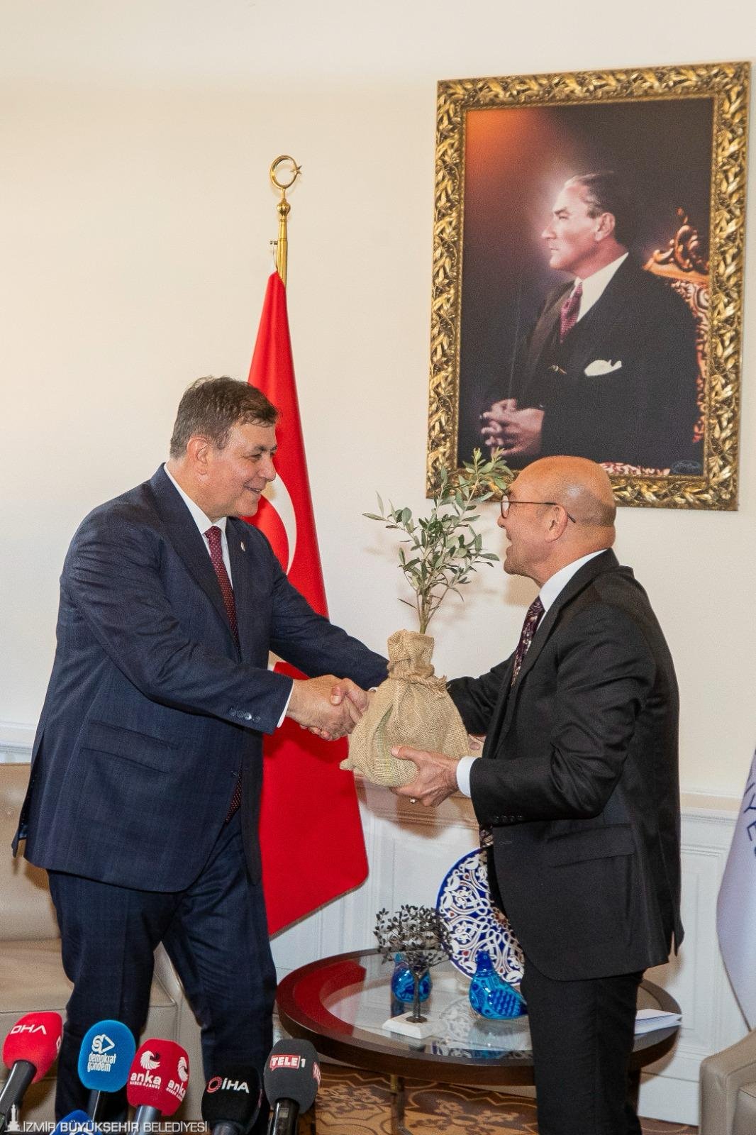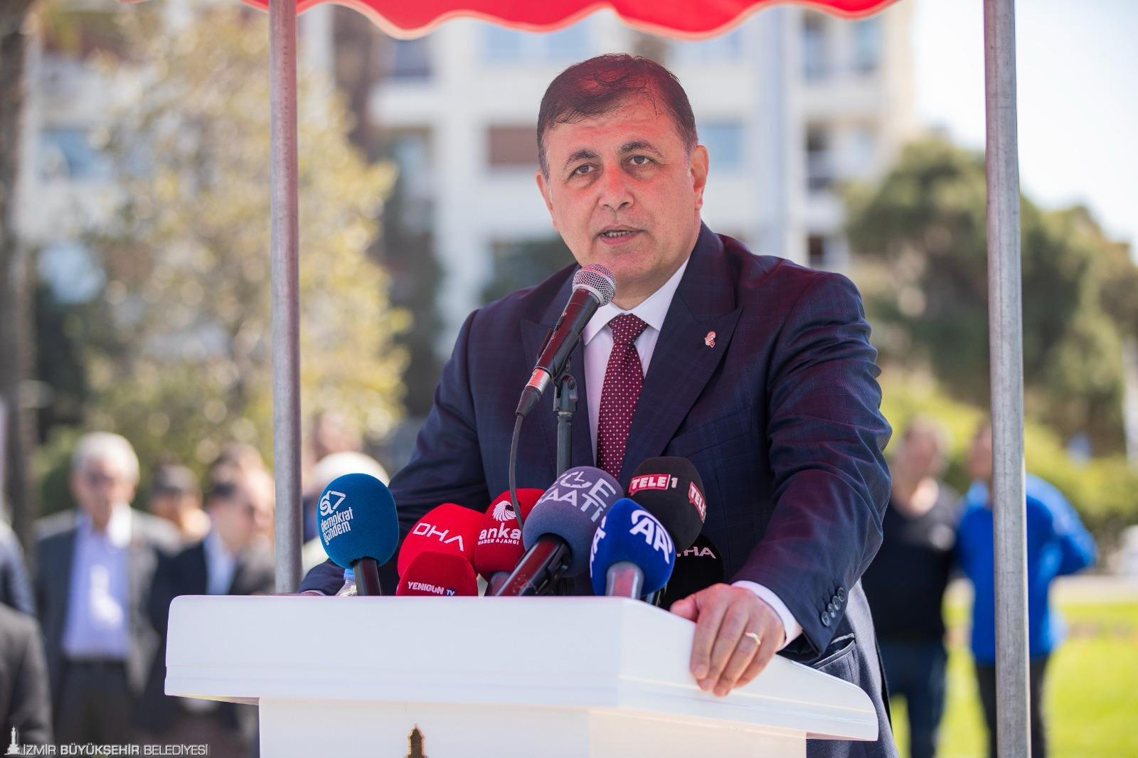 “Çok önemli bir sorumluluğu üstlendiğimin ilk günü. Ne mutlu ki yalnız değiliz, hep birlikteyiz. Seçimde ülke çapında güzel bir başarı yakaladık. Bu başarının mimarları var. Bu başarı için çok emek harcamış milyonlarca insan var. Her birisine bu başarı kutlu olsun. Çok önemli bir sorumluluğun başlangıcındayız. Hepimizin çok çalışması gerekiyor. CHP örgütüne, genel başkan yardımcılarımızdan, milletvekillerimizden, il yönetimimizden başlayarak, tüm parti üyelerimize, İzmir Büyükşehir Belediyesi bünyesinde, gönülden bize destek veren tüm arkadaşlarımıza teşekkür ediyorum. Bizler sadece bir bütünün parçasıyız. Sadece bir bütünün parçası olarak bizden beklenen görevi yerine getirmek üzere bu konumlardayız. Geçici bir süre ile bu konumlardayız. İzmir benim için dünyanın en güzel, en özel şehri. Bu şehre hizmet edebilme fırsatını yakaladık. Bu fırsatı en iyi şekilde değerlendireceğimden kimsenin kuşkusu olmasın. CHP'ye, şehrimize, Atatürk'e borcumuzu ödeyeceğiz. Değerli başkanıma çok teşekkür ediyorum. Geçen 5 yıl içerisinde gecesini gündüzüne katarak şehrimize hizmet etti. Burada dile getirilmemiş pek çok emeğini biliyorum. Bunlar benim için her zaman minnetle hatırlayacağım şeyler. Size duyduğum sevginin sembolü olarak bu zeytin fidanını kendi makam odamda besleyeceğim. Büyüyecek, gelişecek ve sizi unutmadığımızı bu şekilde göstermiş olacağız.”
