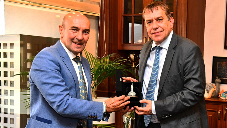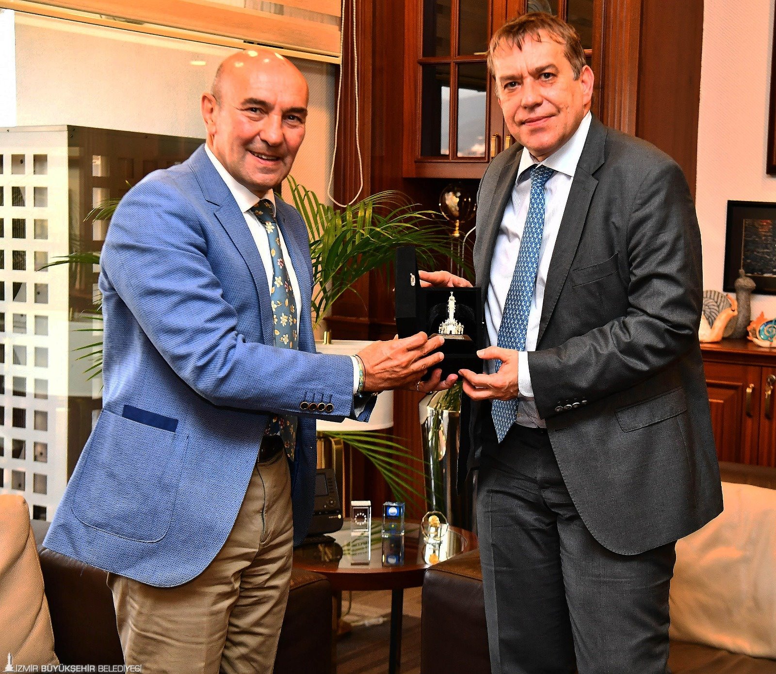 İzmir Büyükşehir Belediye Başkanı Tunç Soyer, Slovenya Ankara BüyükelçisiPrimož Šeligo İzmir’in simgesi saat kulesi maketi hediye etti.