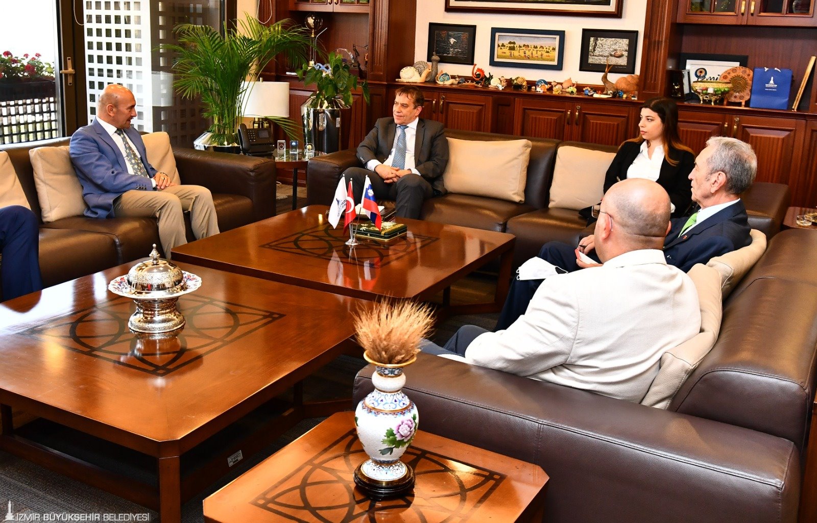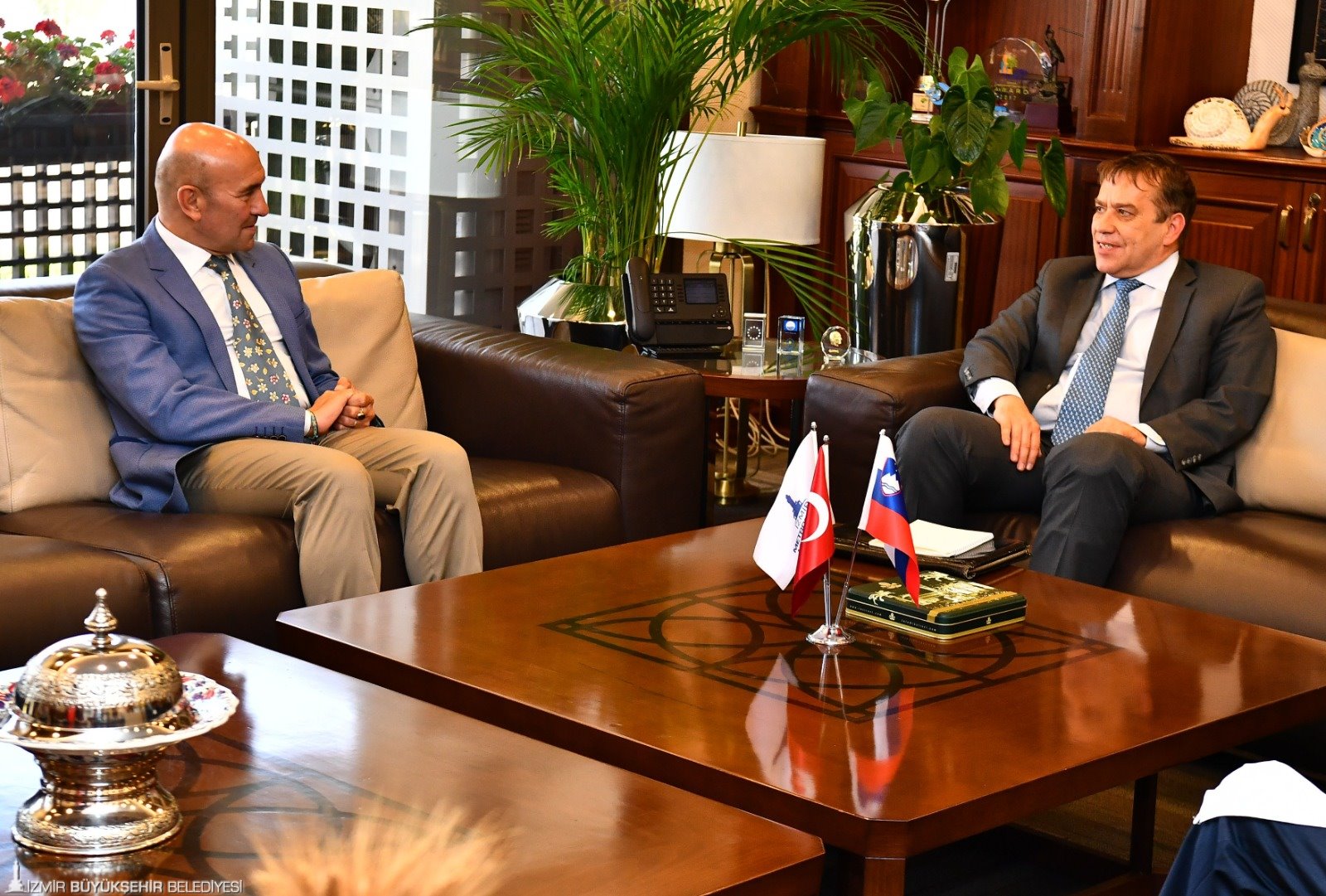 Slovenya Ankara Büyükelçisi Primož Šeligo, İzmir Büyükşehir Belediye Başkanı Tunç Soyer’i makamında ziyaret etti.Slovenya İzmir Fahri Konsolosu Mazhar İzmiroğlu ve Büyükelçilik Ekonomik İlişkiler Danışmanı Bengü Yüksel’in de katıldığı ziyaret, samimi bir havada gerçekleşti. Soyer, konuklarına İzmir hakkında bilgi verdi. Primož Šeligo, İzmir’e ilk kez geldiğini belirtti.Slovenya’nın en büyük ticari limanı Koper ile İzmir’in kardeş kent olabileceklerini söyleyen BüyükelçiŠeligo, işbirliği olanaklarının da altını çizdi. BüyükelçiŠeligo bilişim teknolojileri, sağlık turizmi ve kültürel alışverişin önemini vurgulayarak Koper’den özellikle bu alanlarda çalışan bir delegasyonun İzmir’i ziyaret etmesi önerisinde bulundu. Slovenya Dış İşleri Bakanlığı’nca düzenlenen Bled Ekonomi Forumu’na katılım sağlanması konusu da gündeme geldi.