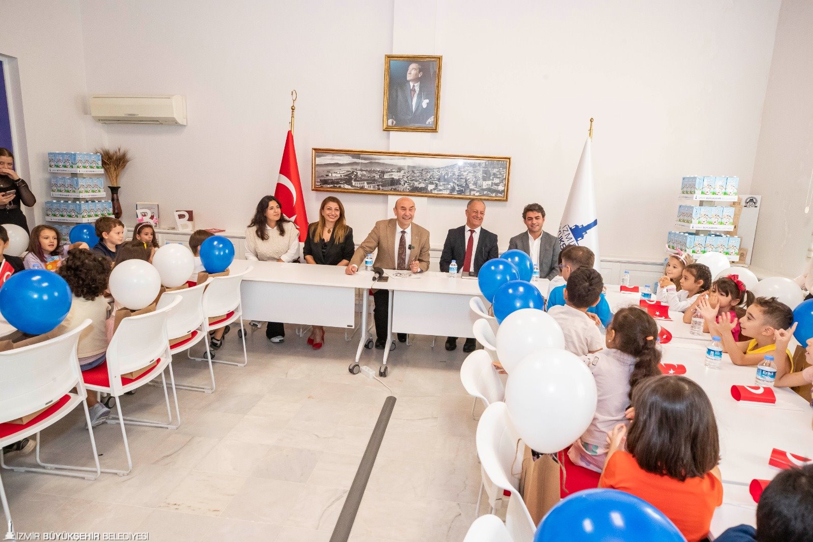Başkan Soyer, toplantı salonunu Türk bayrakları ve balonlarla dolduran miniklerle sütün ve süt içmenin önemi hakkında sohbet etti. Anaokulu Müdürü Hülya Altun ise Başkan Soyer’e Süt Kuzusu projesiyle çocukların gelişimine katkı sağladığı için okul ve veliler adına teşekkür etti. Sohbetin ardından Başkan Soyer öğrencilerle üstünde “Süt İçelim” yazan pasta kesti.
