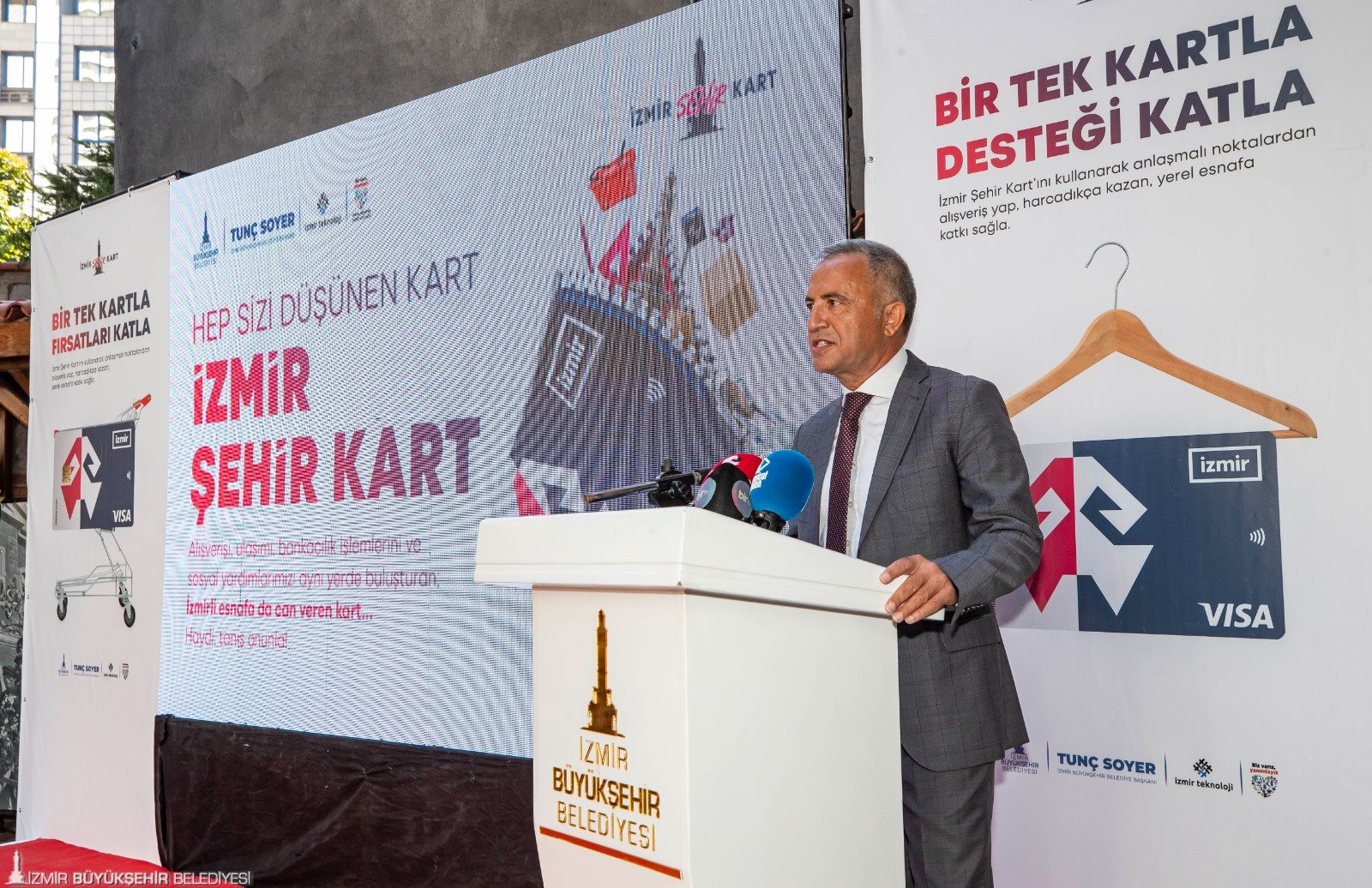 İzmir Büyükşehir Belediye Başkanı Tunç Soyer, dünyanın her yerinde banka kartlarıyla aynı görevi görecek “İzmir Şehir Kartı”nı tanıttı. Kart üzerinden 500 milyonluk liralık sosyal yardımı ihtiyaç sahiplerine ulaştıracaklarını ve bu yolla esnafa da katkı sağlayacaklarını söyleyen Başkan Soyer, “Türkiye’de ilk kez bir büyükşehir belediyesi esnafa bu ölçekte kaynak sağlayacak. Bu bir esnaf devrimidir” dedi.