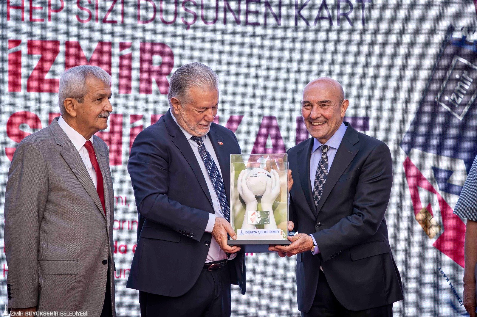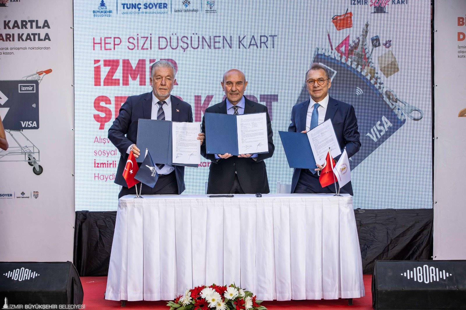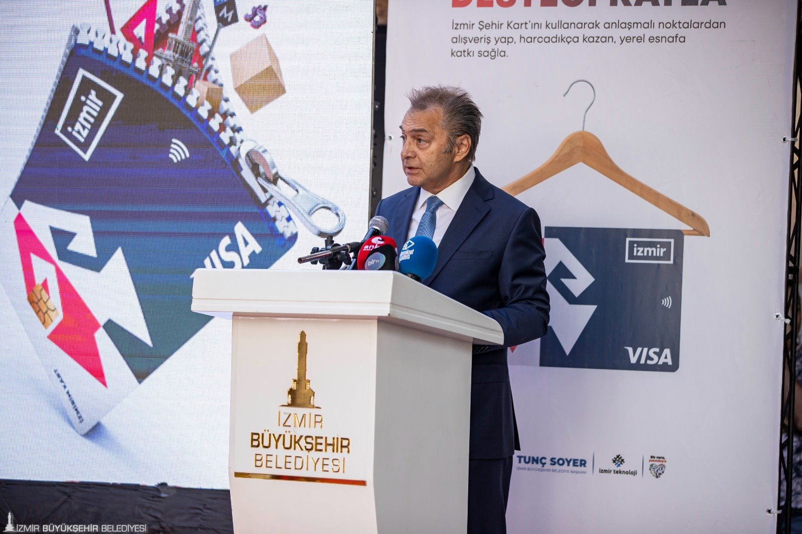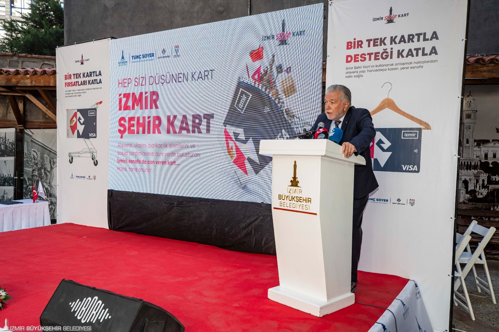 İzmir Şehir Kartını tüm Türkiye’ye tanıtan Başkan Tunç Soyer, “Bu yeni projemiz yalnızca toplu ulaşımda değil, banka kartlarıyla aynı mantıkla çalışan bir ‘mobil cüzdan’ olarak da İzmirlilere hizmet verecek. Vatandaşlarımız belediye hizmetleri başta olmak üzere tüm harcamalarını, online alışveriş ve para transferlerini, üstelik de dünyanın her yerinde bu kartla yapabilecek” dedi.
