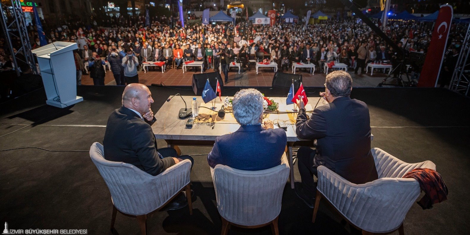Söyleşide Nebil Özgentürk ve Zülfü Livaneli’nin sorularını yanıtlayan Başkan Soyer, “Barışa hasretiz barış çok önemli. Barış çok büyük özlemimiz barış yoksa tencerede çorba yok. Barış yoksa umut yok. Bugünün siyasal ikliminde çatışmadan, kutuplaştırmadan medet umanlar, barışı bize çok görüyorlar. Bizi birbirimizden ayıran sebeplerden çok daha fazla birleştiren sebepler var. Onun için birbirimize sarılmaya, kucaklaşmaya ihtiyacımız var. Ancak barış varsa birlikte yaşamanın mutluluğu ve huzur var. Denizler ayırmaz birleştirir. Ege Denizi iki yakayı birleştirir. Bizim o kadar çok ortak tarihimiz var ki; biz, politikacılardan, onların kararlarından sıyrılabilsek hepimiz o kadar güzel kucaklaşırız ki, edebiyatta, sanatta, müzikte, kitapta o kadar çok kucaklaşacağımız şey var ki. Vicdan dedik ya; vicdan barışı arar” şeklinde konuştu.