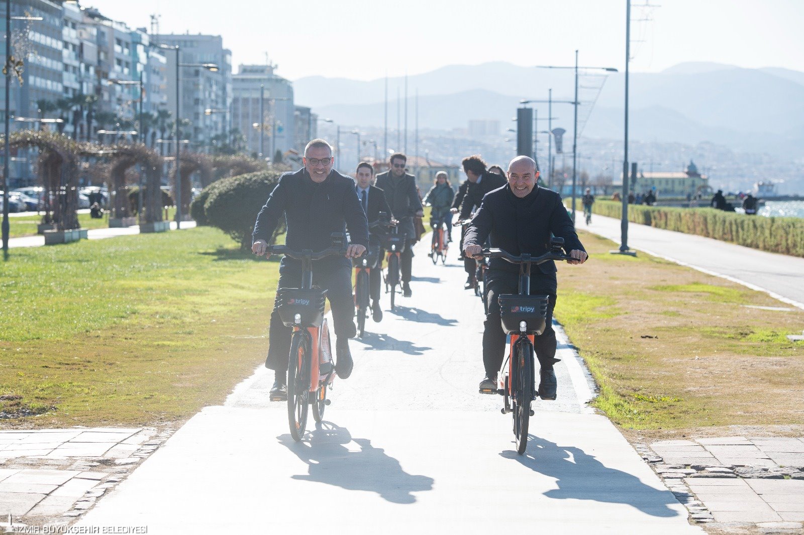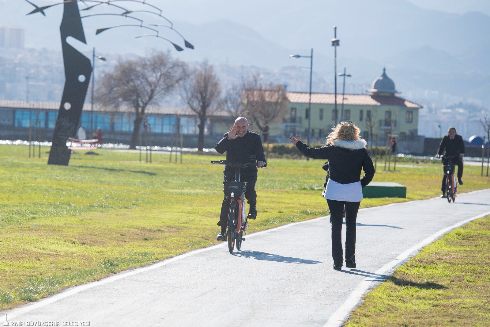 İzmir’de bisiklet kullanımını artırmak ve kenti dirençli hale getirmek için beş yıl önce verdiği sözü hatırlatan İzmir Büyükşehir Belediye Başkanı Tunç Soyer, “Artık Körfez’i çepeçevre kuşatan kesintisiz bir bisiklet yolumuz var. Bisiklet Eylem Planımız kapsamında yaptığımız çalışmalarla mevcut bisiklet yolu ağımızı 111 kilometreye yükselttik. Bisiklet kiralama sistemimiz BİSİM ile İzmir’de bisiklet kültürünü yaygınlaştırdık. Şehrimizin doğayla uyumlu ulaşım ağına büyük yatırımlar yaptık. Son 5 yılda, 26 yeni BİSİM istasyonu açtık ve istasyon sayısını 34’ten 60’a çıkardık. BİSİM, 60 istasyon ve 990 bisiklet ile şehrimize hizmet veriyor. Bisiklet filomuza, görme engelli vatandaşlarımız ve çocuklarımız için 120 özel bisikleti dahil ettik. Bisiklet ulaşımının toplu taşımaya entegrasyonunu sağladık. Bisiklet sürücüleri körfez içi vapur seferlerinden sadece 5 kuruş̧ gibi sembolik bir rakam karşılığında faydalanabiliyor. Bu örnek çalışmamızla bisikleti ile deniz ulaşımını kullanan yolcu sayısında yüzde 82'lik bir artış sağladık. Bisikletli yolcuların ESHOT otobüslerimizde de rahatlıkla seyahat edebilmesi için özel aparatlar ekledik. İzmir’i EuroVelo Avrupa Bisiklet Ağına dahil ettik. EuroVelo bisikletli turizm rotalarımızı her geçen gün geliştirdik. Dikili - Çandarlı, Menemen Kırsal Rotaları ve Efes - Pamucak Rotalarını açtık. Tüm bu çalışmalarımız sonucunda 2020 yılında ulaşım modları arasında yüzde 0,5 olan bisikletli yolculuk oranı neredeyse 1 puana yükseldi” dedi.