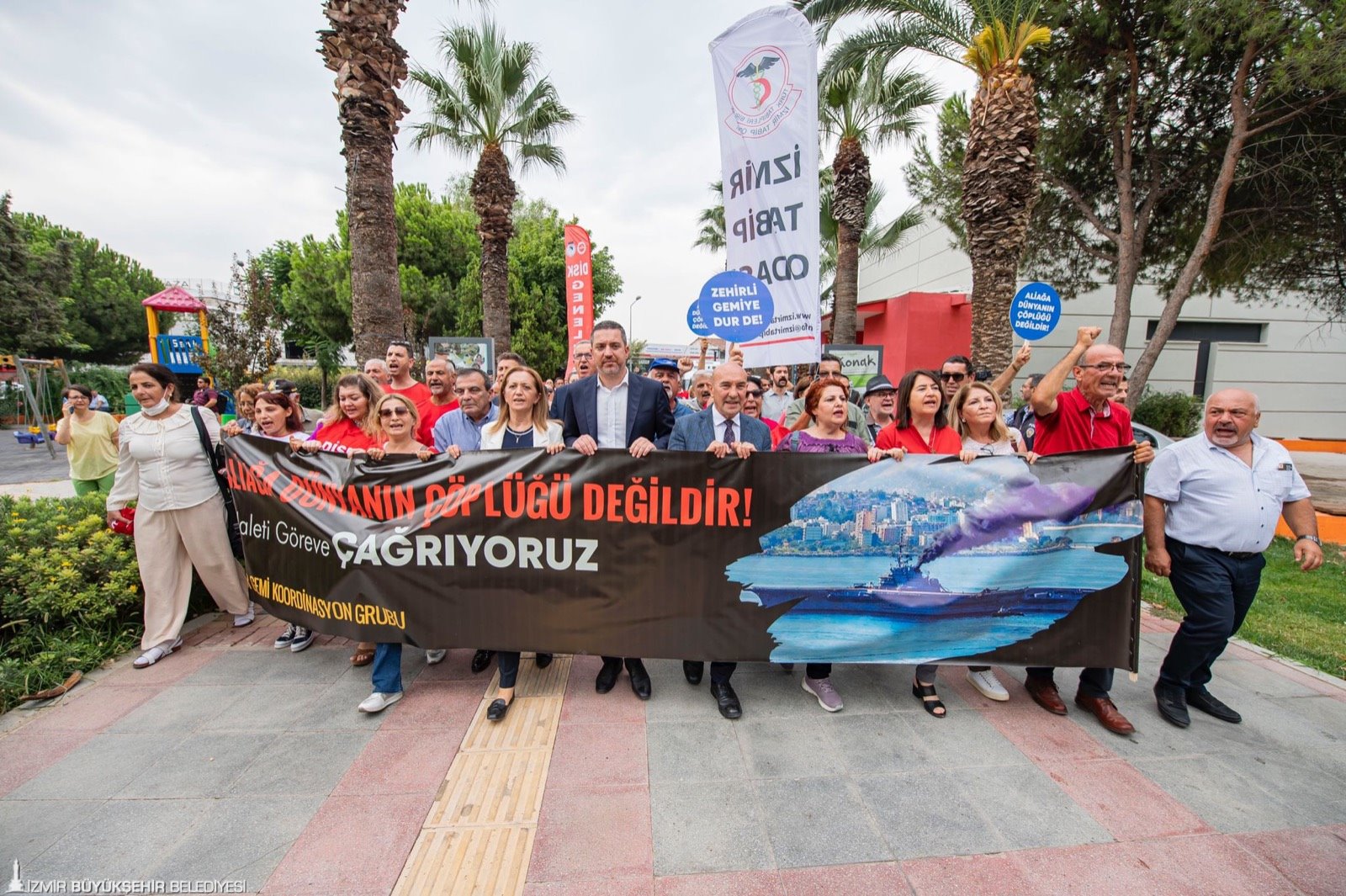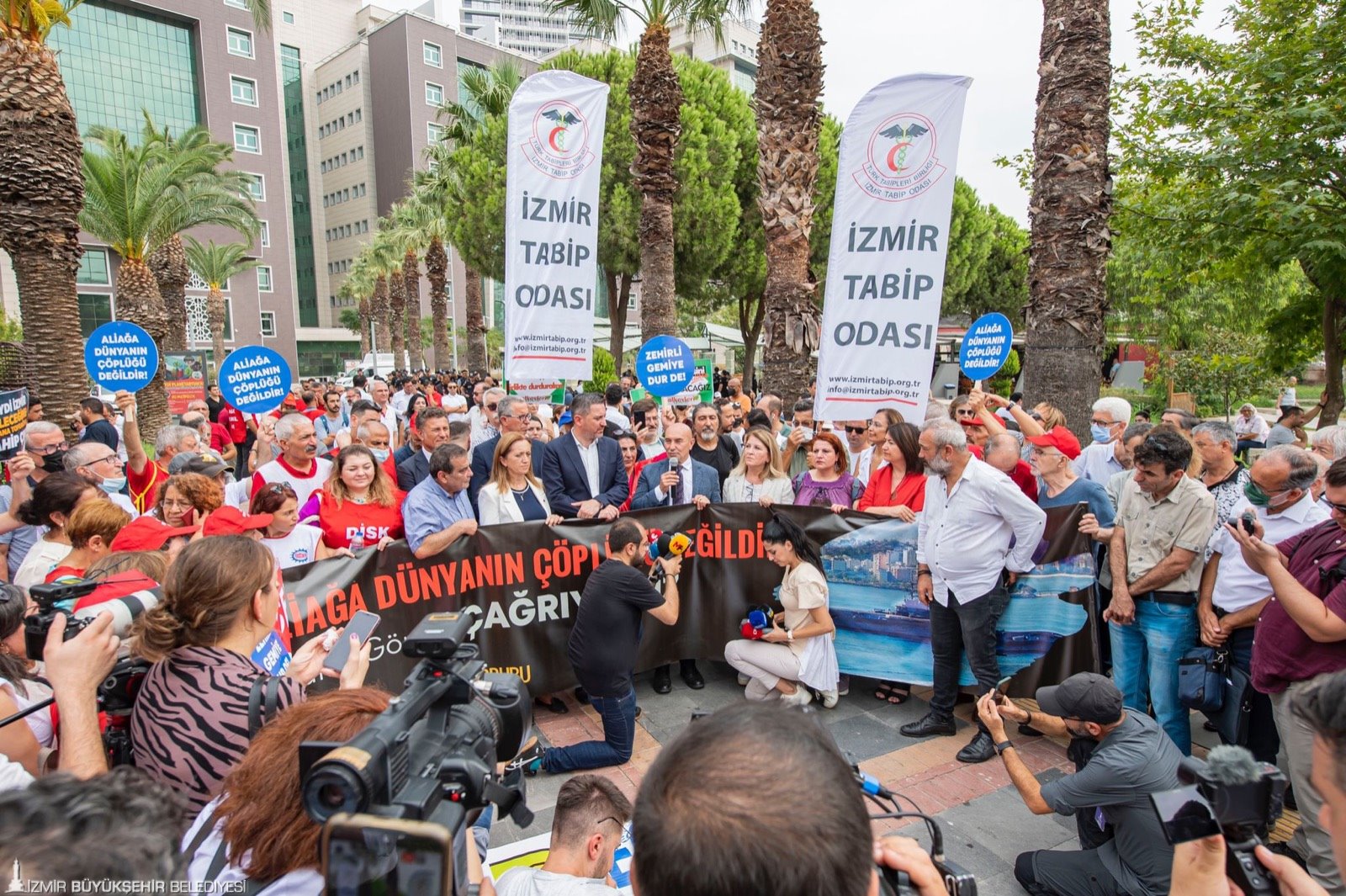 İzmir Barosu Başkanı Özkan Yücel de, “Bugün burada Türkiye’nin hasret kaldığı bir ilke şahitlik ediyoruz. İzmir’den bir sivil itaatsizlik hareketi başlattık. Bu çağrı Türkiye’ye ilişkindi. Bugün burada bütün Türkiye’yi temsil eder biçimde meslek örgütü temsilcileri ve sendika başkanları burada aynı çağrıya, aynı talebe ortaklık ediyorlar. Bir taraftan sokağı, bir taraftan mahkemeleri onlara dar etmeye kararlıyız. Her yolu deniyoruz. Bunlardan biri mahkeme. Yarın bu mahkemeden yürütmeyi durdurma kararı çıkmazsa denizleri de onlara dar etmeye kararlıyız. Hatırlatalım. Onlar da İzmir’de yaşıyorlar İzmir’in zehirlenmesine izin vermemek kendileri için de gerekli bir şey. Gecikmeden karar verilmesi gerekir, savunma hadi alınmadan yürütmenin durdurulması kararı verilmesini istiyoruz” ifadelerini kullandı.