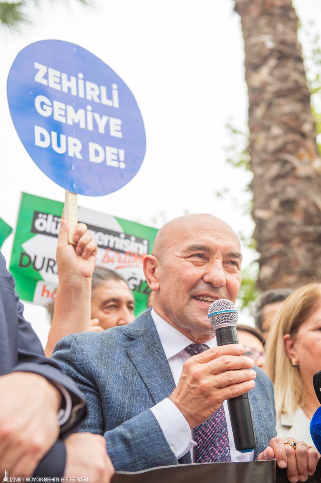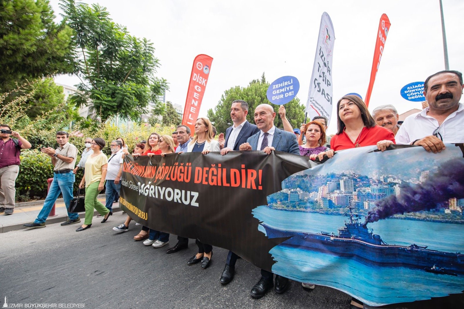 Gösterilen çevre duyarlılığına vurgu yapan Başkan Tunç Soyer, “Bu şehre hep birlikte sahip çıkmanın gururunu yaşıyorum. Biz ölüm gemisi diyoruz, toksik gemi diyoruz ama düzeltmeye ihtiyaç var aslında. Gelen gemi falan değil. Gemi olma özelliğini tamamen yitirmiş bir kargo geliyor. Zehir, çöp kargosu... Gelen binlerce tonluk bir çöp, zehir. Öncelikle bunu anlamamız lazım. Bu sabah 850 kardeşimizi İzmir’den Afyon’a yolcu ettik. Atatürk’ün ve ordumuzun yürüdüğü güzergahı yürüyecekler. Çünkü bugün büyük zaferin başladığı ilk gün. Emperyalist şimdi zehirleriyle, çöpleriyle işgal ediyor ülkeleri ama geçit yok. Emperyalizme, faşizme İzmir geçit vermeyecek. Geldikleri gibi geri göndereceğiz. Çünkü bu vatanı bize emanet edenler kanlarıyla, canlarıyla, özgürlüğün, barışın ve cumhuriyetin bedelini ödediler. Bir belediye başkanının asli görevi şehrini korumaktır. Diğer vazifeler sonra gelir. Ben İzmir Büyükşehir Belediye Başkanı olarak söz veriyorum. Son nefesime kadar İzmir’in ağacını, denizini, Aliağa’sını korumak için canla başla çalışacağım. O gemiyi hep birlikte buradan geldiği gibi geri göndereceğiz” dedi.