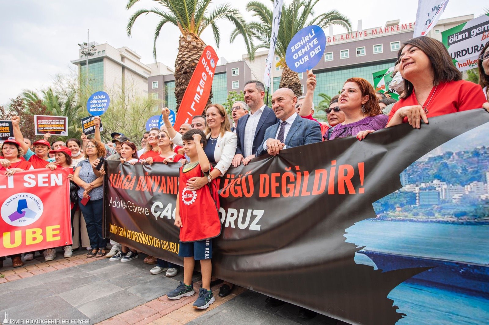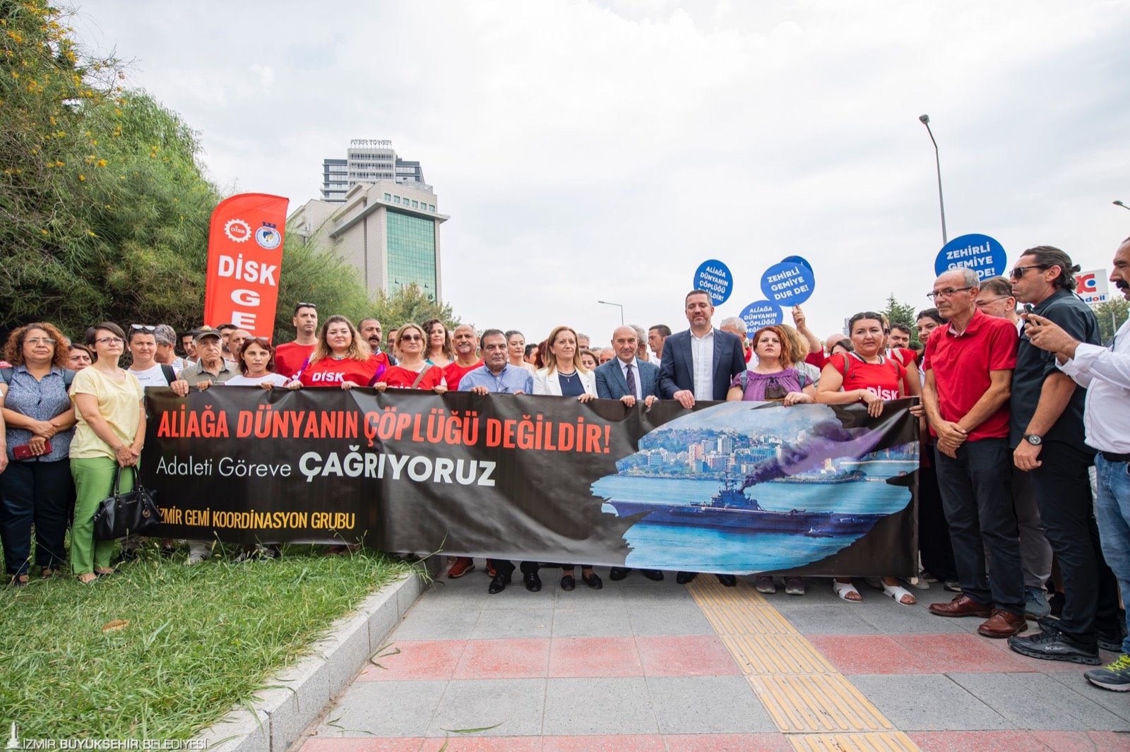 DİSK Başkanı Arzu Çerkezoğlu ise şunları söyledi: “Bugün emeğimizi, doğamızı, insana dair ne varsa her şeyi değersizleştiren düzene karşı buradayız. DİSK olarak burada dostlarımızla birlikte zehir gemisinin topraklarımıza, İzmir’e, ülkemize girmesini engellemek ve dur demek için buradayız. Rant uğruna işçi sağlığını, doğamızı yok sayarak bu geminin gelişine izin veriyorlar. Eğer o gemi su alırsa hepimiz batacağız diyorlar ya herkes bilsin yıllardır bu ülkede emeğimizi değersizleştirenlerin, doğamızı sermayeye peşkeş çekenlerin bu ülkenin tüm değerlerini yok sayanların gemisinde biz hiçbir zaman olmadık, olmayacağız. Onların zihniyetinin gemisidir bu. Bizim gemimiz İzmir’in özgürlük rüzgarı ile yol alan Ege sularında yürüyen yelkenlilerdir. Bu süreçte üzerimize düşeni yapacağız ama biliyoruz ki bizleri yok sayan her şeyi piyasaya açan düzen artık tüm dünya halklarının geleceğini tehdit ediyor. Emek temelinde yeni bir toplumsal düzeni inşa etmek için bugünden yarına daha fazla omuz omuza vererek mücadelemizi büyüteceğiz.”