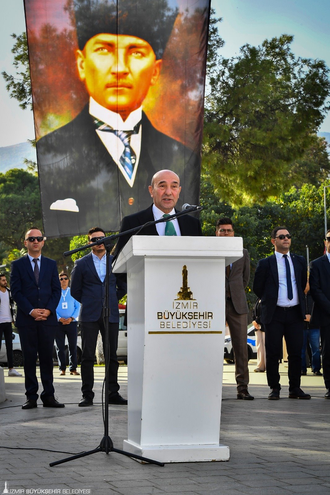 Ulu önder Mustafa Kemal Atatürk ve silah arkadaşlarını anarak konuşmasına başlayan İzmir Büyükşehir Belediye Başkanı Tunç Soyer, “Cumhuriyet’in kuruluşu sadece bu topraklarda egemenliğin kayıtsız, şartsız milletin elinde olduğunu tüm dünyaya göstermekle kalmadı. İstiklâl mücadelesi sonucunda bağımsızlığını kazanan Türkiye Cumhuriyeti, tüm mazlum ülkelere ilham kaynağı oldu. Etkisi kendi coğrafyasının çok ötesine ulaşan bu insanlık eserini 100. yılında anmamak hiçbir koşulda mümkün değildir. Elbette en büyük coşkuyla anacağız, heykellerini dikeceğiz. Elbette 'Her fabrika bir kaledir' diyen, 'Yurtta Sulh Cihanda Sulh' diyen düsturlarının takipçisi olacağız. Çünkü biliyoruz, unutursak yok oluruz. Unutmayacağız, unutturmayacağız, asla vazgeçmeyeceğiz” dedi.