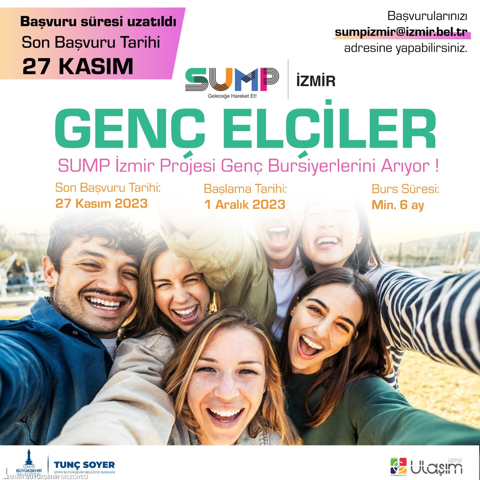 İzmir Büyükşehir Belediyesi’nin Avrupa Birliği (AB) ile yürüttüğü İzmir Sürdürülebilir Kentsel Hareketlilik Planı kapsamında sürdürülebilir ulaşıma katkı sağlayacak üniversite öğrencilerine proje bursu verecek. İzmir Büyükşehir Belediyesi Ulaşım Dairesi Başkanlığı tarafından yürütülen SUMP İzmir projesinin, genç nesil tarafından benimsenmesi, gençlerin sürdürülebilir ulaşım alışkanlıkları amacıyla kriterlere uygun bulunan 8 üniversite öğrencisi burs almaya hak kazanacak. 1 Aralık 2023 tarihinde başlayacak burslar 6 ay süreli olacak.