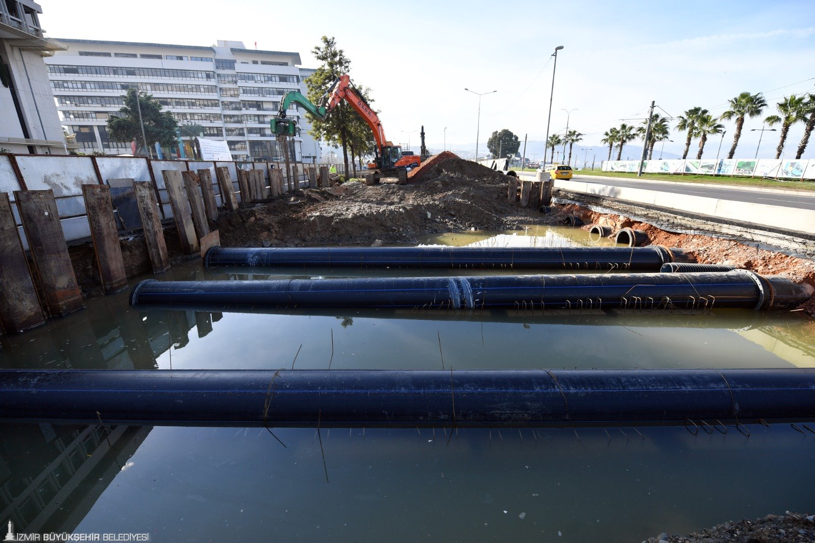 İzmir Büyükşehir Belediyesi, aşırı yağışlarda İkiçeşmelik ve yüksek kesimlerden gelerek Kemeraltı'nda baskınlara neden olan yağmur sularının terfi merkezinde toplanıp denize deşarj edilmesini sağlayacak önemli bir yatırımı da sürdürüyor. "Kuşaklama yöntemiyle" yürütülen çalışmalar kapsamında Atatürk Caddesi’nde terfi merkezi ile deniz arasında 90 santimetre çapında 72 metre uzunluğundaki 7 adet yağmur suyu borusunun döşeme çalışmaları son aşamaya geldi. Kemeraltı Kuşaklama Altyapı Projesi kapsamında Eşrefpaşa Caddesi, Gazi Bulvarı, Gaziosmanpaşa Bulvarı ve Çankaya bölgesine yağmur suyu ve kanalizasyon hattı döşenecek. Şehit Fethi Bey Caddesi'nde yağmur suyu ızgaraları yapılacak. Saat Kulesi ile Fevzipaşa Bulvarı arasındaki içme suyu hattı yenilenecek. Gazi Bulvarı, Fevzipaşa Bulvarı, Eşrefpaşa Caddesi'ndeki içme suyu ve atıksu hatlarının yenilenmesi ile bölgedeki mevcut alt yapı güçlendirilmiş olacak. Toplam 21,7 milyon liraya mal olacak çalışmaların 7 ayda tamamlanması hedefleniyor.