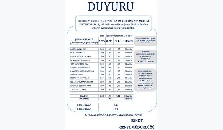 Yapılan düzenlemeye göre Balıklıova-F.Altay, Foça-Hatundere, Y.Foça-Biçerova, Gerenköy-Biçerova, İYTE-F.Altay hatlarında 50 kuruşa varan indirimler gerçekleştirildi.3-5 Bilet’te eski tarifeye devam