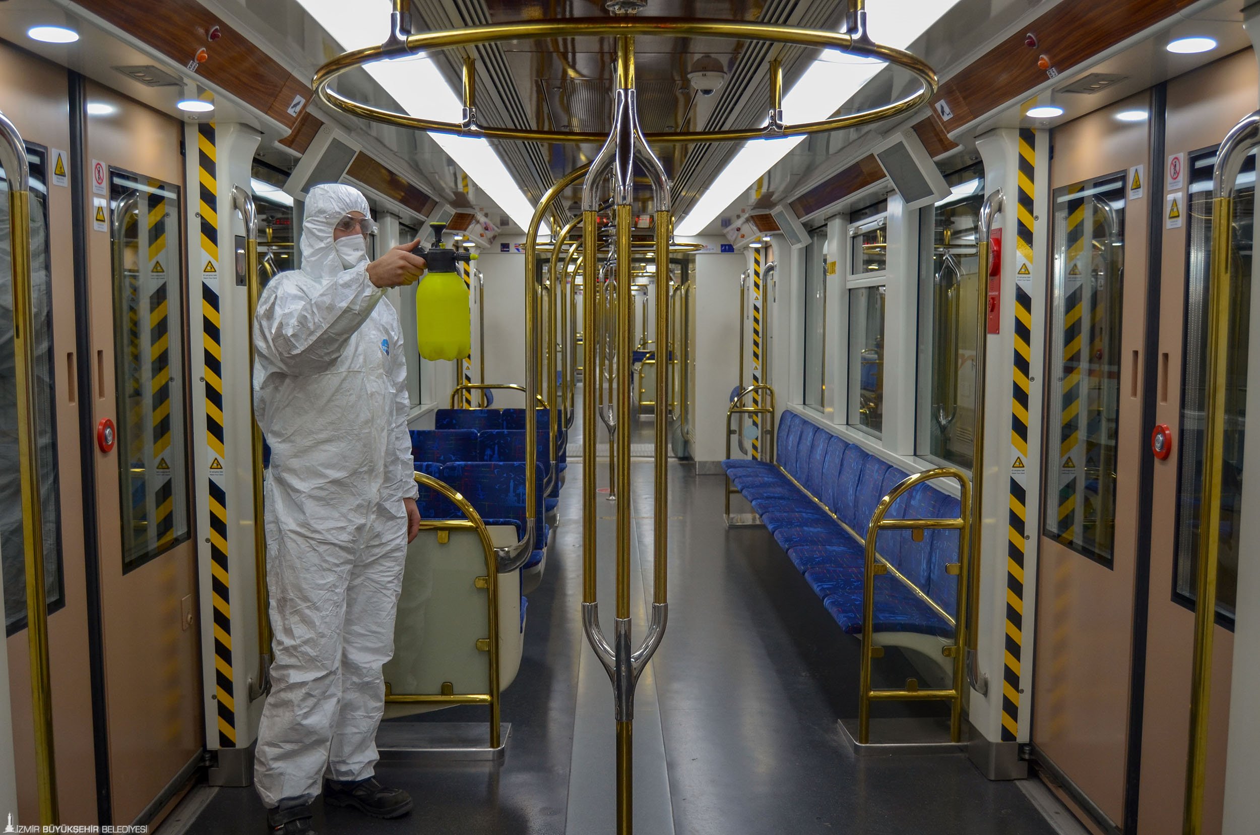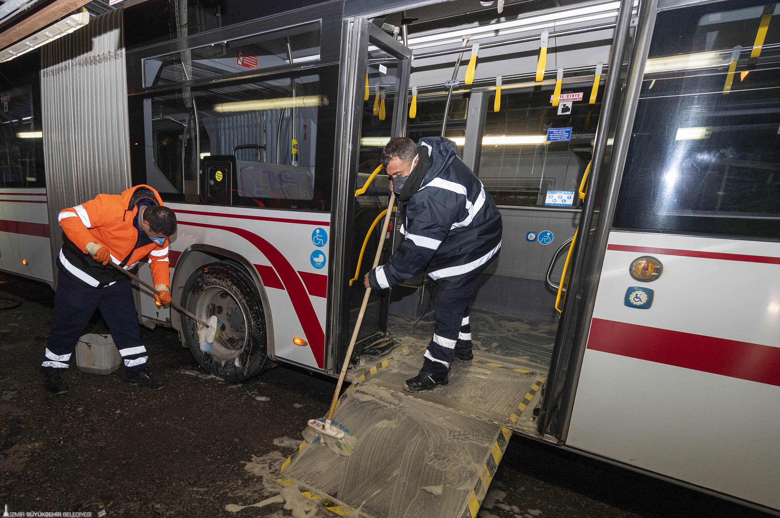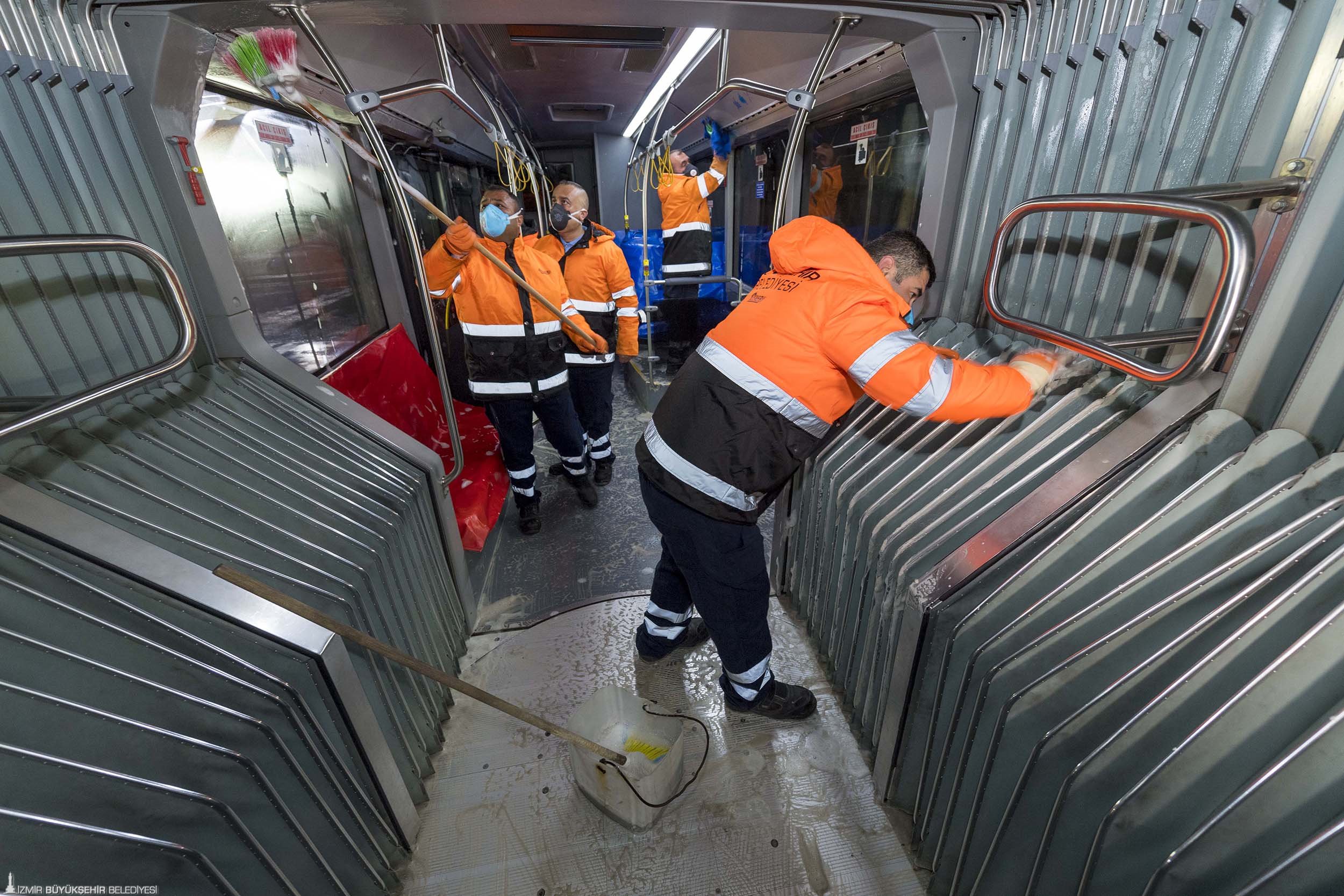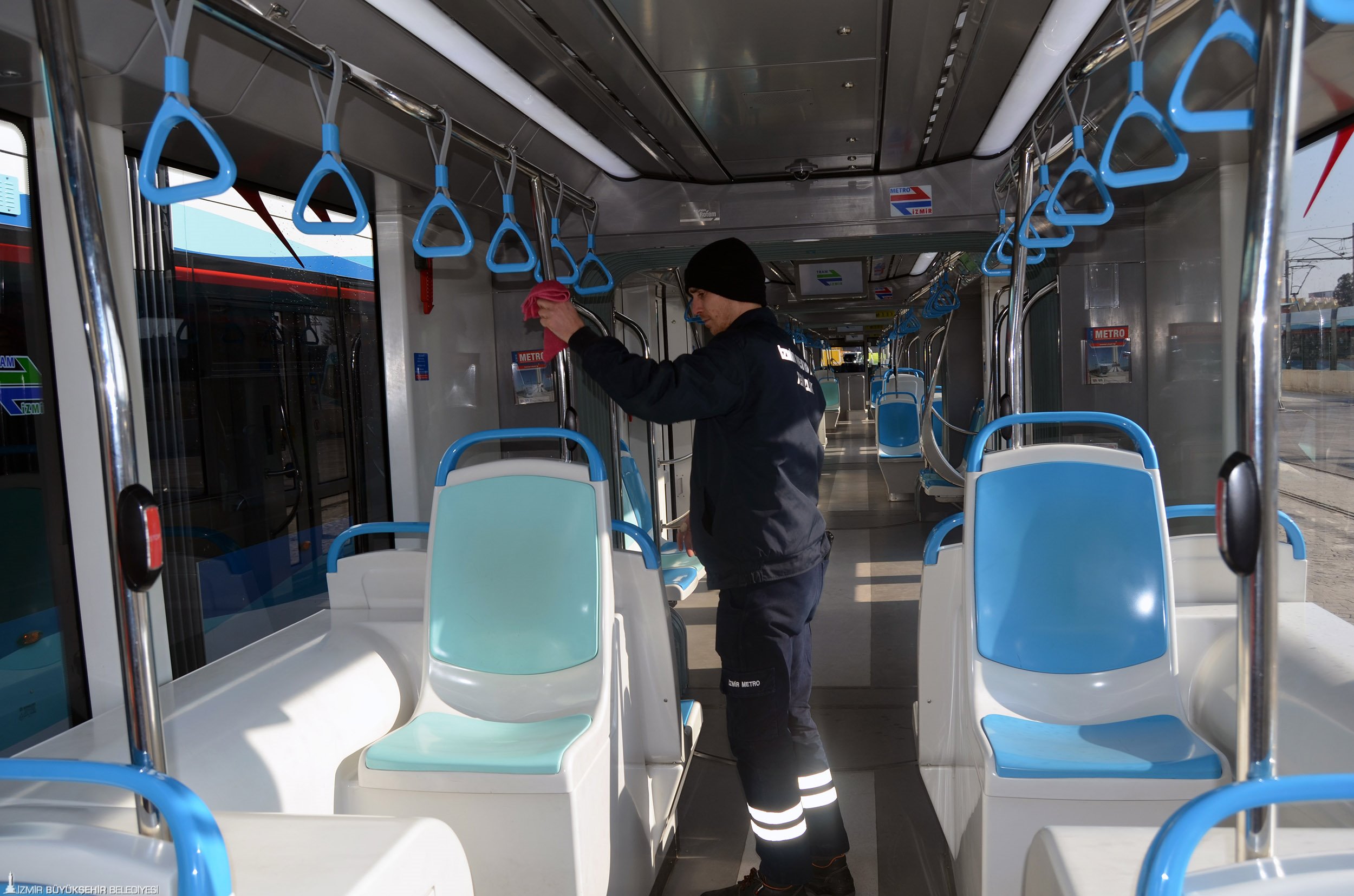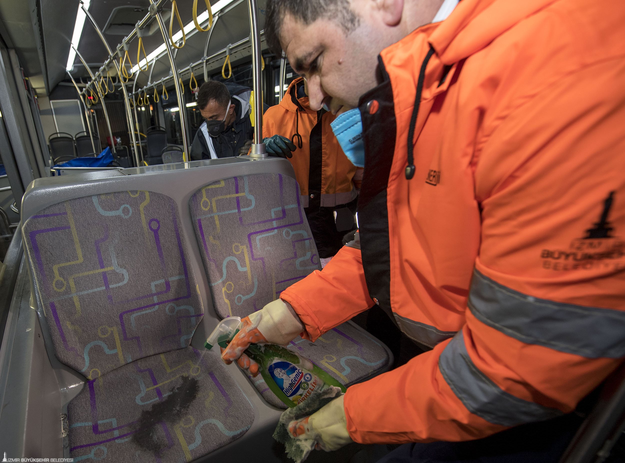 İzmir Büyükşehir Belediyesi’ne bağlı toplu ulaşım araçlarında temizlik ve dezenfeksiyon faaliyetleri aralıksız sürüyor. Hijyen ve sanitasyon belgelerine sahip uzman ekipler, tüm toplu ulaşım araçlarında koltukları temizliyor, zeminleri paspaslıyor, camları ve yan yüzeyleri siliyor. Yolcuların temas ettiği tutamak, korkuluk ve tırabzanlar da dezenfekte ediliyor. Tüm bu işlemlerde insan sağlığına zararlı olmayan TSE onaylı temizlik ürünleri kullanılıyor.