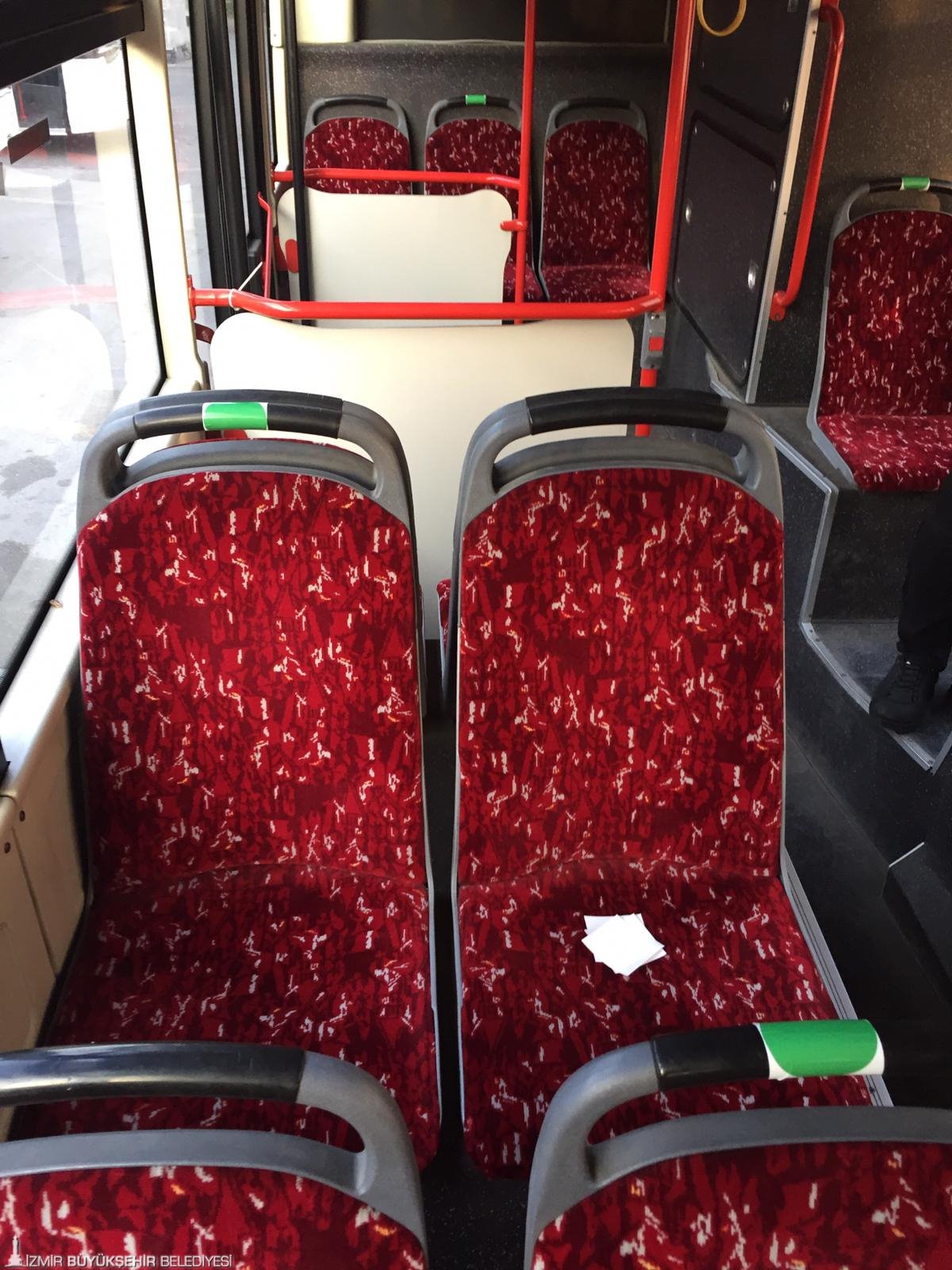 İçişleri Bakanlığı’nın yayımladığı Koronavirüs Genelgesi, toplu ulaşım araçlarına kapasitelerinin yüzde 50’sinden fazla yolcu alınmasına yasak getirdi. Karar uyarınca, İzmir Büyükşehir Belediyesi’nin tüm toplu ulaşım araçlarında “yeşil koltuk uygulaması” başlatıldı. Toplu ulaşım araçlarına binenler bugünden itibaren yeşille işaretlenmiş koltuklara oturacak ve diğer yolcularla arasındaki sosyal mesafeyi koruyacak. Yolcuların yanlarındaki koltuklar boş kalacak, arkadakiler ise çaprazdaki koltuklara oturabilecek.