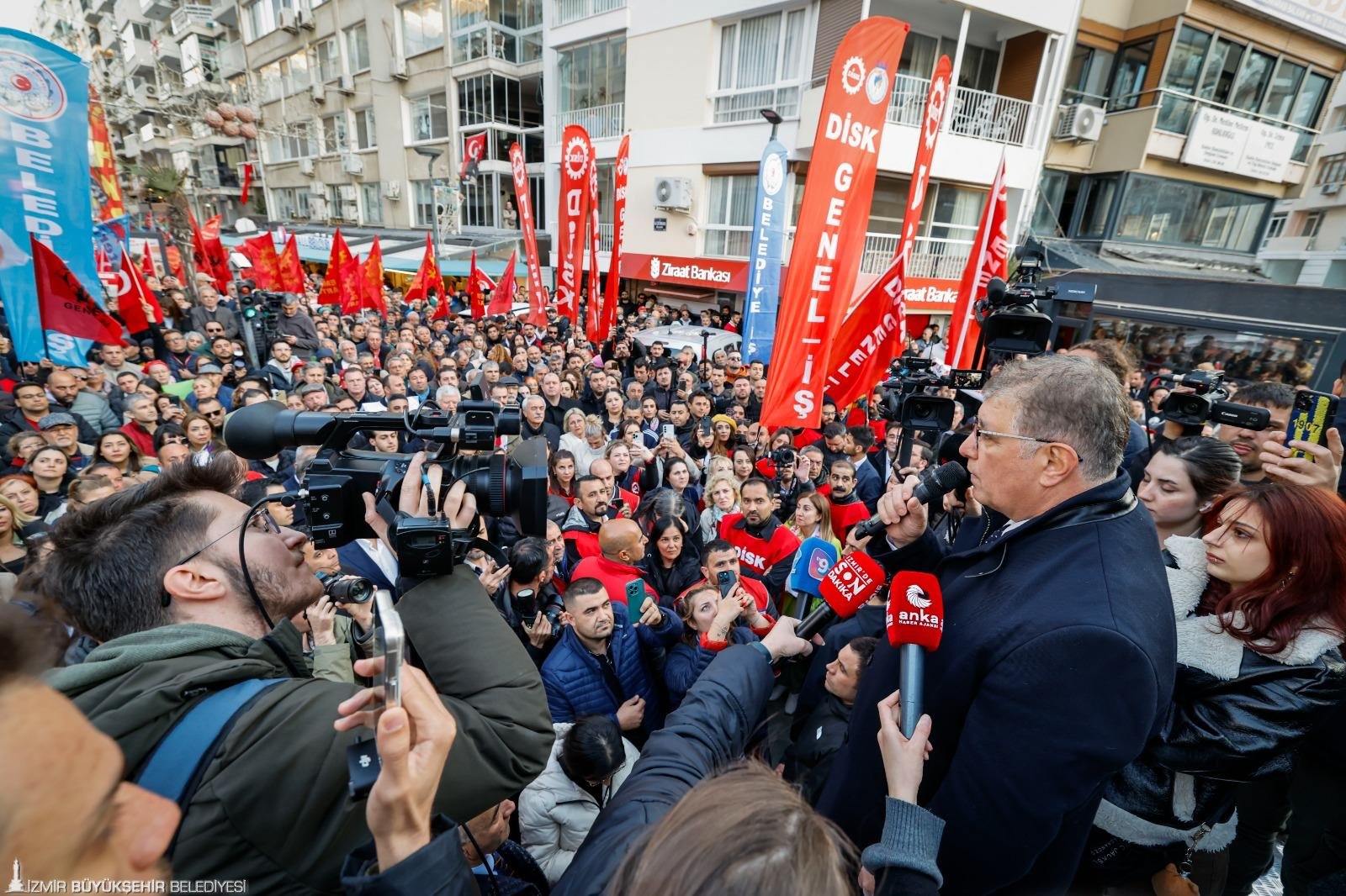 Vatandaşlara seslenen İzmir Büyükşehir Belediye Başkanı Dr. Cemil Tugay, “Zor günler geçiriyoruz ama biz zor günleri 22-23 yıldır geçiriyoruz. Her geçen yıl bir öncekinden daha fazla şeyi kaybederek, özgürlüklerimizi, haklarımızı kaybederek, gençlerimiz de gelecek umutlarını kaybederek bu süreyi geçiriyoruz. Çok üzüntülü birkaç gün geçirdik. Ekrem İmamoğlu birkaç gündür nezarethanede, belki kuru bir sedirin üzerinde uyuyor geceleri. O da her biriniz gibi etten kemikten insan. Onun da anne babası, evlatları var. Onun da yüreği sızlıyor. Sizler onu siyasetçi olarak tanıyorsunuz, ben bir arkadaş olarak, bir yoldaş, kardeş olarak sizlerden biraz daha fazla tanıyorum. O yüzden inanın; içinizdeki isyan her neyse, aklınızdaki düşünceler her neyse, neye itiraz ediyorsanız onun iki katını ben hissediyorum ve içimde taşıyorum. Saraçhane’de, İzmir’de, Ankara’da, Türkiye’nin dört bir köşesinde vatandaşlarımızın bizden ne istediğini düşünüyorum. Biz ne yapmayı istiyoruz onu düşünüyorum. Biz eşitlik, adalet, demokrasi istiyoruz ve bunu sadece bir grup insan için değil, sadece kendi yandaşlarımız için değil, bu ülkede yaşayan ve yaşayacak olan herkes için istiyoruz” dedi.