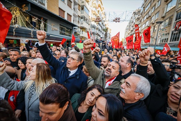 19 Mart günü yapılan operasyonla gözaltına alınan İstanbul Büyükşehir Belediye Başkanı Ekrem İmamoğlu’na İzmir’den destek sürüyor. İzmir Büyükşehir Belediye Başkanı Dr. Cemil Tugay, CHP İzmir İl Başkanı Şenol Aslanoğlu, milletvekilleri, ilçe belediye başkanları, sendikalar, odalar, dernekler ve on binlerce vatandaşla birlikte destek yürüyüşünde buluştu. Lozan Meydanı’ndan Gündoğdu Meydanı’na doğru sloganlar eşliğinde yürüyen İzmirliler, “kurtuluş yok tek başına, ya hep beraber ya hiçbirimiz”, “her şey çok güzel olacak”, “hak, hukuk, adalet”, “susmuyoruz, korkmuyoruz, itaat etmiyoruz” sloganlarıyla yürüdü.