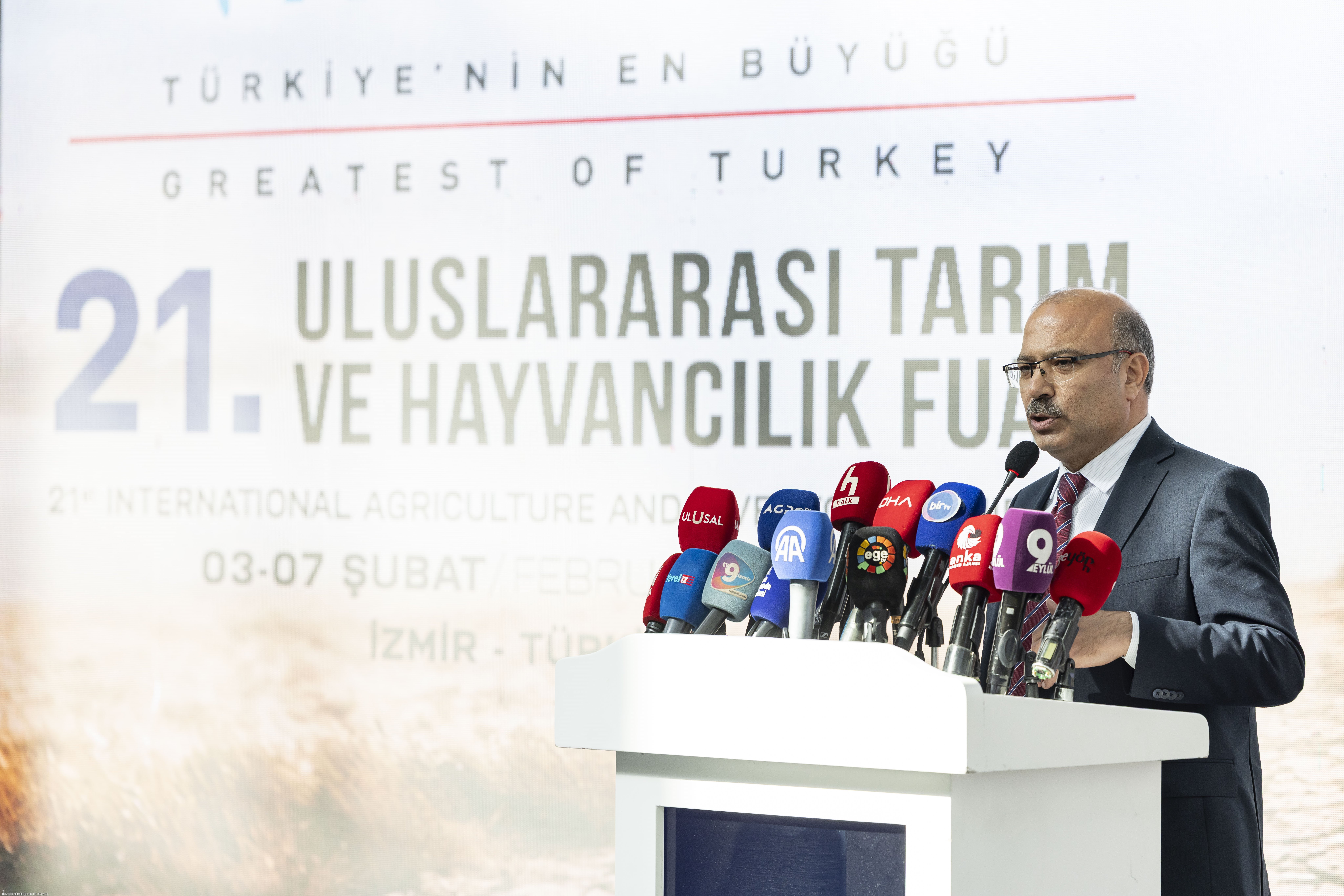 Açılış töreninde konuşan İzmir Büyükşehir Belediye Başkanı Dr. Cemil Tugay, İzmir’in tarım ve fuarcılık kenti olduğunu vurguladı. Fuarda, tarım sektörünü ileriye taşıyacak birçok yenilikçi çözümün yer aldığını belirten Tugay, yapay zekâ destekli tarım makineleri, akıllı sulama sistemleri, veri temelli üretim modelleri ile su verimliliğini artıran teknolojilerin önemine dikkat çekti. Bu çözümlere herkesin ihtiyaç duyduğunu ifade eden Tugay, dünyanın zorunlu bir dönüşüm sürecinden geçtiğini söyledi. Küresel ölçekte ciddi krizlerle karşı karşıya olunduğunu belirten Tugay, gıda krizi, iklim krizi, su krizi ve kuraklığın artık birbirinden ayrı başlıklar olmadığını vurguladı. Birleşmiş Milletler Gıda ve Tarım Örgütü verilerine göre 2024 itibarıyla dünyada 673 milyon insanın açlıkla mücadele ettiğini, yaklaşık 2 milyar 600 milyon kişinin ise sağlıklı beslenemediğini aktaran Tugay, bilim insanlarının gezegenin 1 derece ısınmasının temel tarım ürünlerinde yaklaşık yüzde 10 verim kaybına yol açacağını ortaya koyduğunu söyledi.