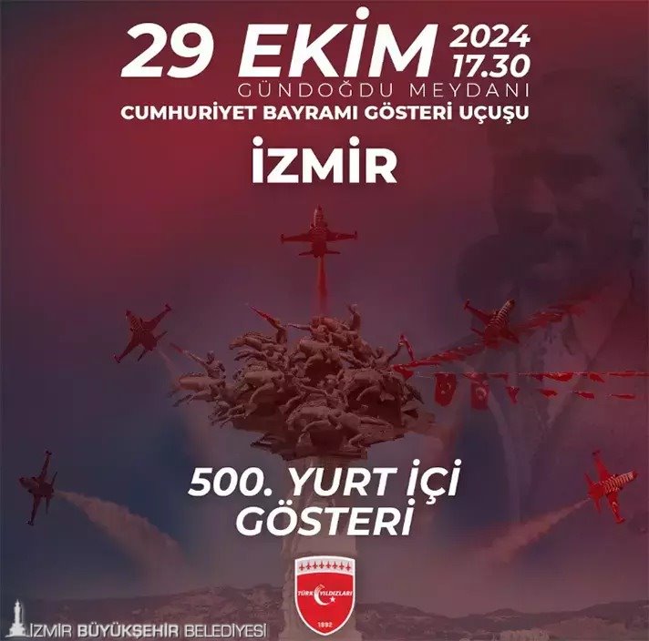Türk Yıldızları’nın Cumhuriyet Bayramı Gösterisi, 29 Ekim Salı günü saat 17.30’da Gündoğdu Meydanı’ndan izlenebilecek. Türk Yıldızları NF-5 tipi uçaklarla İzmirlilere gökyüzünde nefes kesen bir gösteri yapacak.