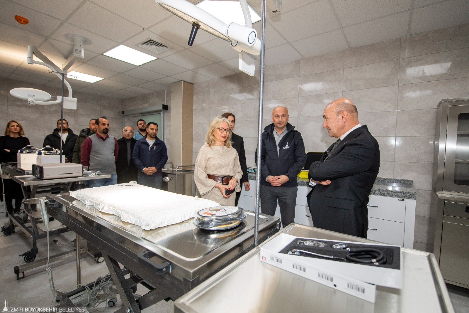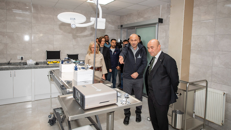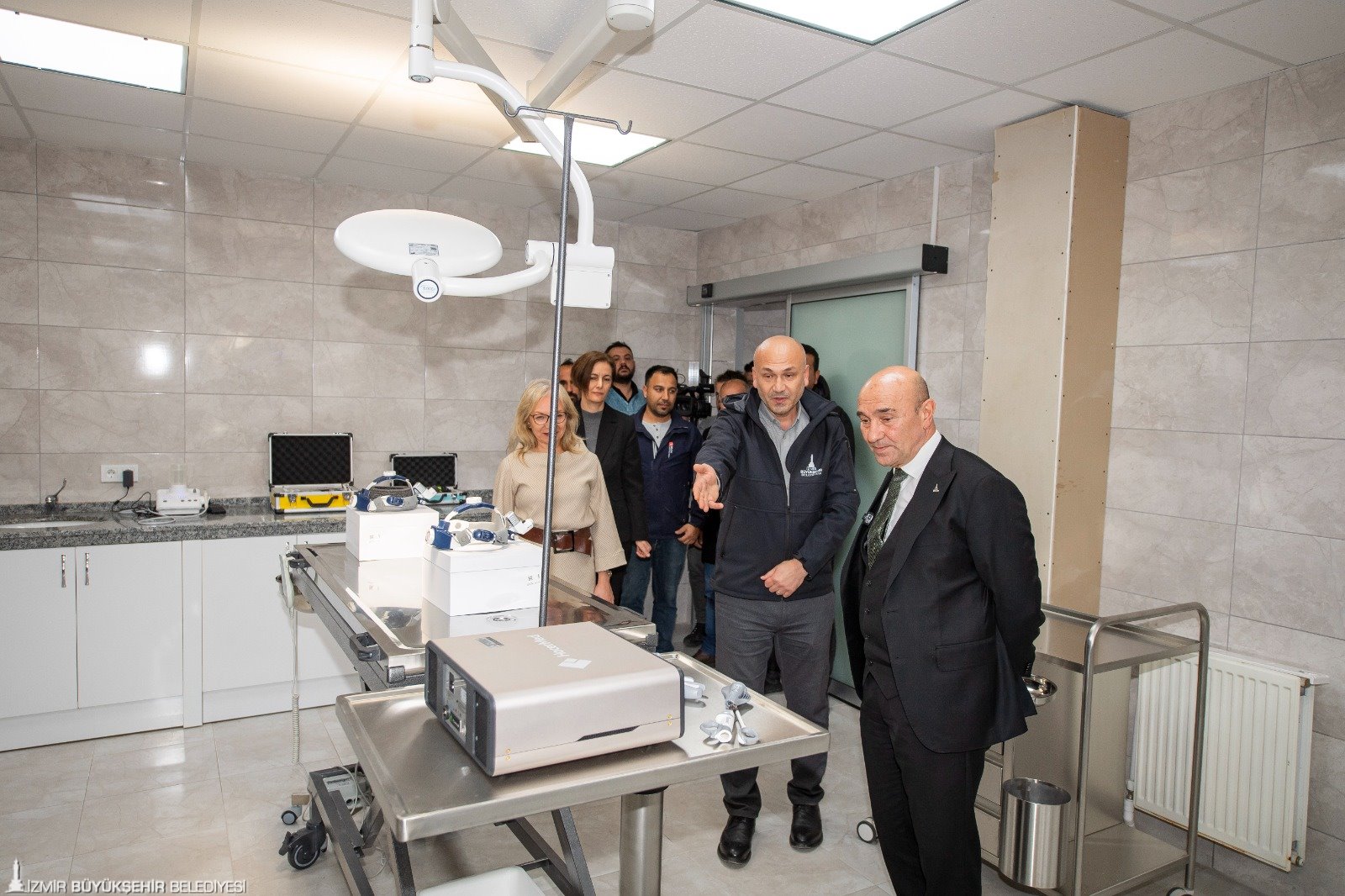 Açılış öncesi hastanedeki son hazırlıkları yerinde inceleyen İzmir Büyükşehir Belediye Başkanı Tunç Soyer, Genel Sekreter Yardımcısı Şükran Nurlu’dan bilgi aldı. Başkan Tunç Soyer, “Çok ciddi bir yatırımla, sadece İzmir’in değil Türkiye’nin en büyük hastanesini hizmete açacağız. Olağanüstü yüksek standartta hastane ekipmanı ile donatıldı. Röntgen, ultrason, ameliyathane, kuvöz gibi her türlü eksiğin tamamlandığı bir hastaneyi kente kazandırıyoruz. İzmirlilerin içi rahat etsin, sokak hayvanlarımıza 7/24 hizmet verecek olağanüstü donanımlı teknik ekibimiz var. Son derece yüksek standartta hastanemiz var. Onları doyuracak sağlıklı lezzetli mamalarımız var. Burası dört dörtlük bir tesis” dedi.