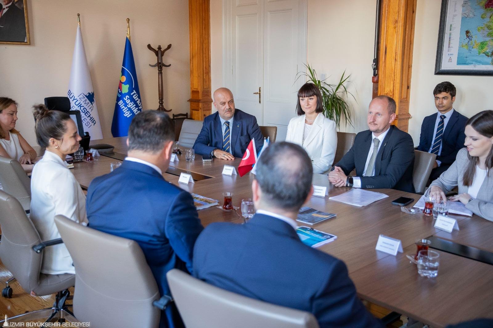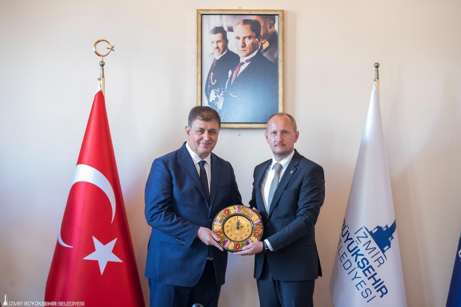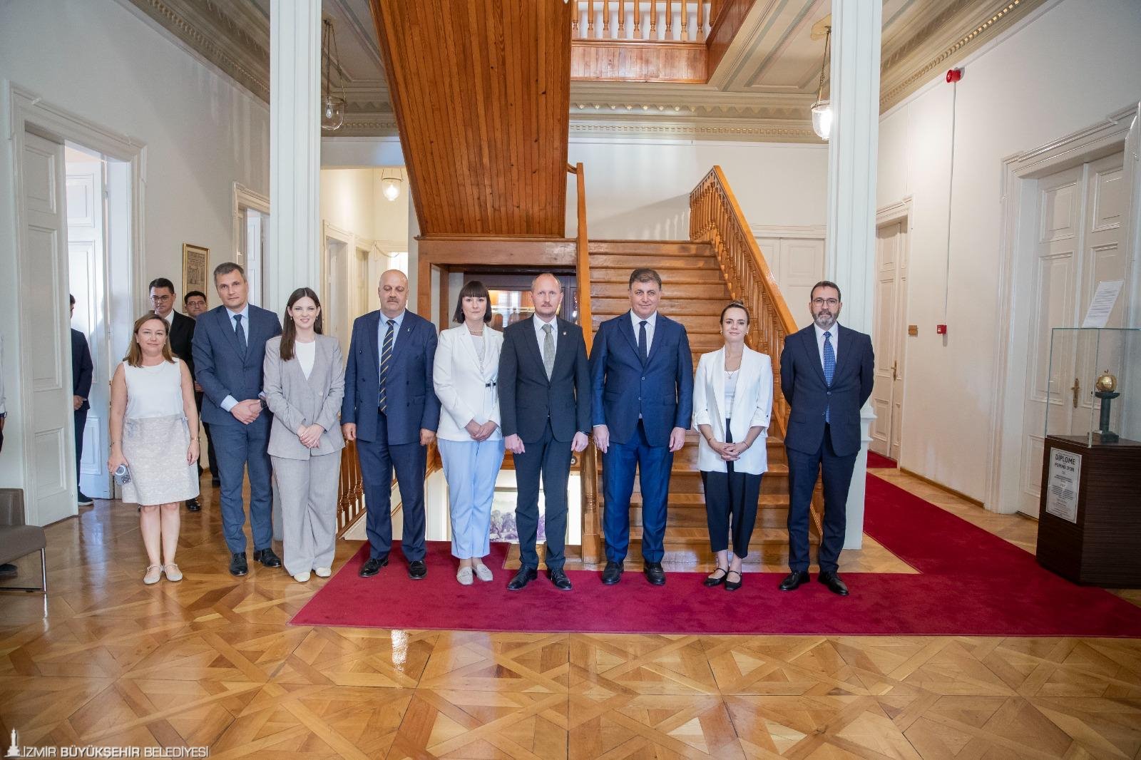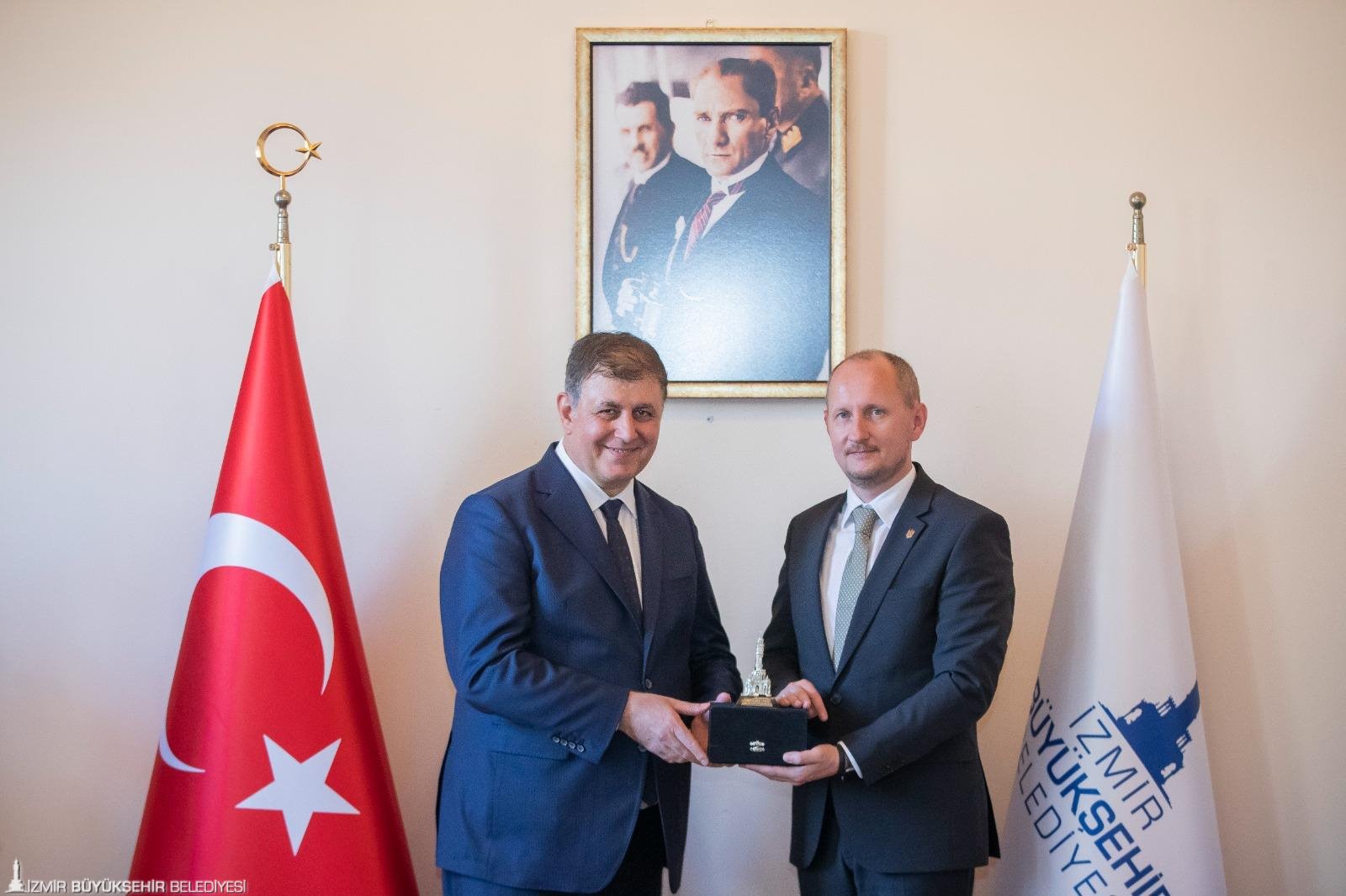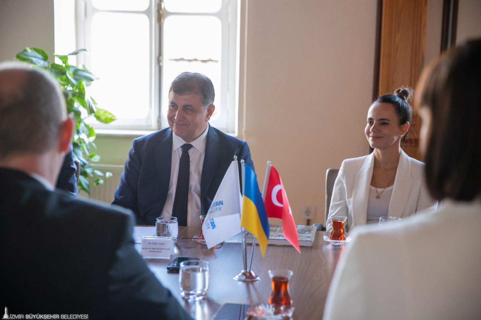 Ukrayna’nın İstanbul Başkonsolosu Roman Nedilskyi ve eşi Liudmyla Nedilska ile beraberindeki heyet, İzmir Büyükşehir Belediye Başkanı Dr. Cemil Tugay’ı makamında ziyaret etti. Ziyarete Başkan Cemil Tugay’ın eşi Öznur Tugay ve İzmir Büyükşehir Belediyesi bürokratları katıldı.