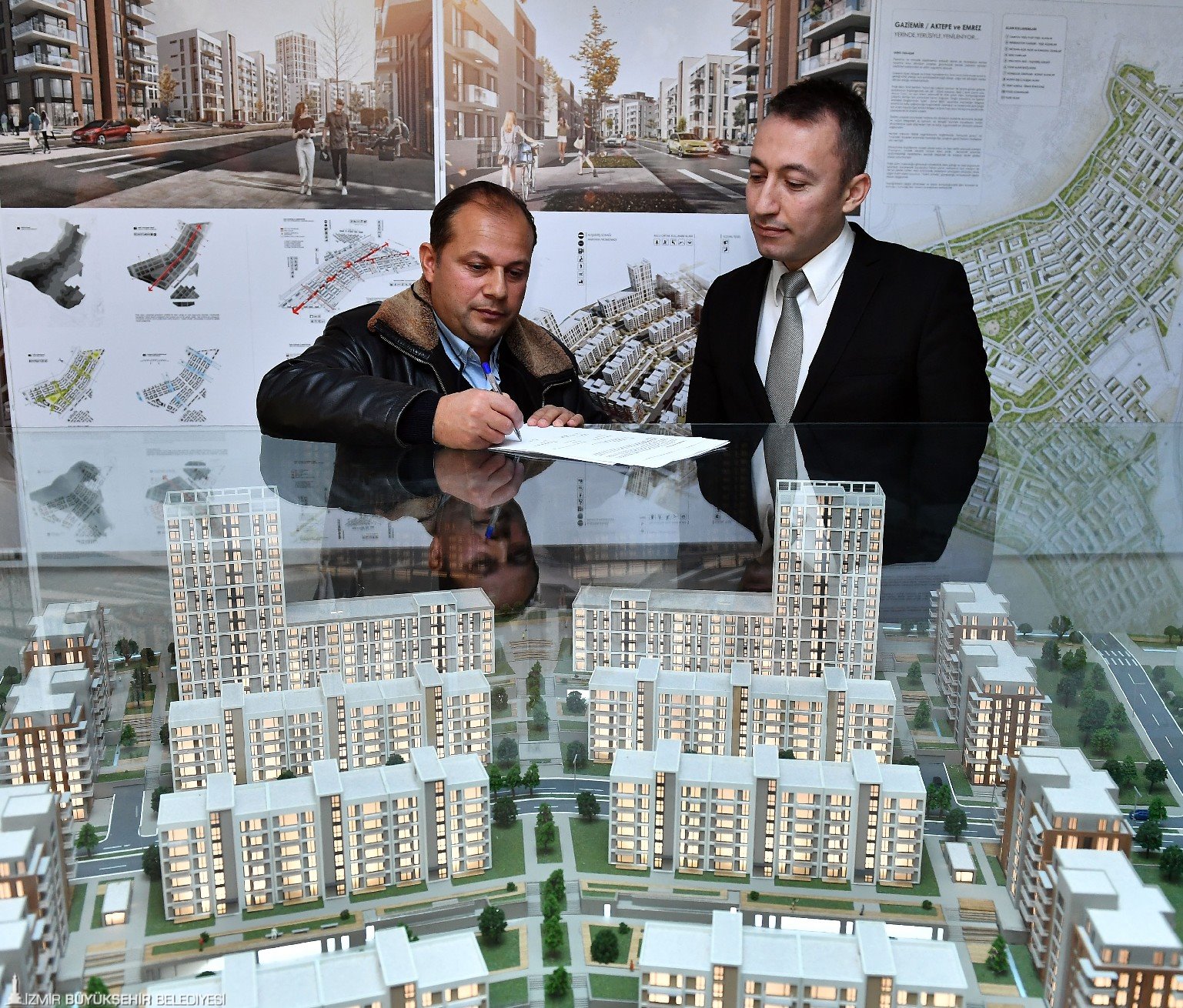 İzmir Büyükşehir Belediyesi Kentsel Dönüşüm Daire Başkanlığı Proje İkinci Şube Müdürü Vekili İsmail Mutaf uzlaşma sürecinin hak sahipleriyle birebir görüşmelerle yürütüldüğünü söyledi. Mutaf “Uzlaşma sağladığımız alanlarda sözleşme imzalayarak hak sahiplerinin arsalarını Büyükşehir adına devralıyoruz. Ardından hak sahiplerine kira desteği sağlayıp alanı tahliye ediyoruz. Bazı bölgelerde ise geçici iskanı sağlamak için Büyükşehir’e ait konutları tahsis ediyoruz” dedi. Diğer bölgelerden farklı olarak Gaziemir’de Kentsel Dönüşüm Yasası kapsamında bedel karşılığında Hazine’den devralınan Büyükşehir mülkiyetindeki arsada yaklaşık 600 bağımsız birim için kat karşılığı anahtar teslim yapım ihalesine çıkılacağını ifade eden Mutaf “Böylece hak sahipleri ile uzlaşma görüşmeleri devam ederken bir yandan da konut inşası başlamış olacak” diye konuştu.