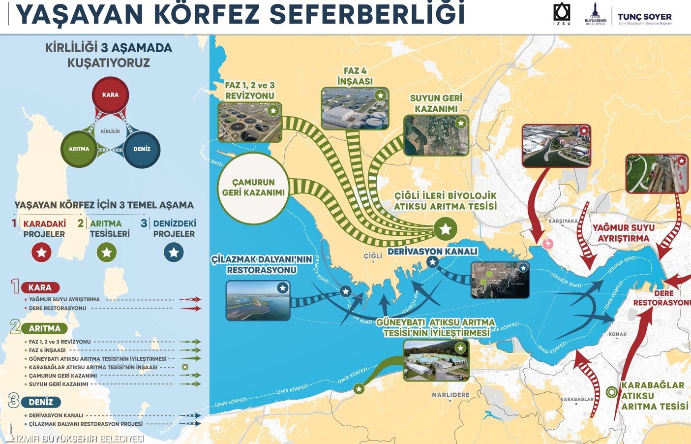 “Yaşayan Körfez” programının ikinci ayağı ise kent merkezinin arıtma kapasitesini artırmak ve arıtma faaliyetini birden fazla noktaya dağıtmak. İZSU Genel Müdürlüğü, bir taraftan mevcut arıtma tesislerinin kapasitesini artırma diğer yandan kent merkezinin arıtmasını üç ayrı noktaya dağıtma kararı aldı. Bu doğrultuda projelendirilen yatırımlar bir bir hayata geçmeye devam ediyor.
