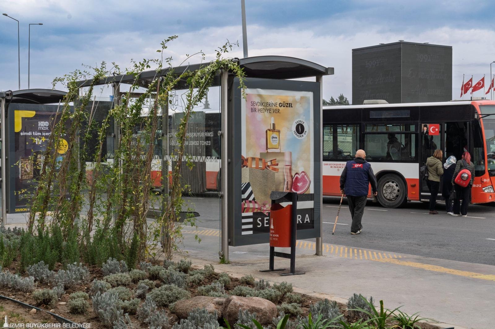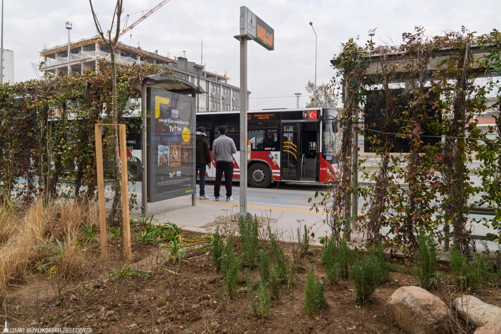 İzmir Büyükşehir Belediye Başkanı Dr. Cemil Tugay’ın daha az suyla daha yeşil bir İzmir hedefiyle başlattığı yeşil dönüşüm çalışmaları, viyadük altları, refüjler ve kavşaklar gibi kamusal alanların ardından otobüs duraklarıyla devam ediyor. İzmir Büyükşehir Belediyesi Park ve Bahçeler Dairesi Başkanlığı, kent merkezinde hizmet veren ESHOT otobüs duraklarının üstünde ve çevresinde peyzaj çalışmaları başlattı. İklim krizine duyarlı, az su tüketen kurakçıl bitkilerle gerçekleştirilen peyzaj çalışmaları kapsamında durak çevreleri yeşil bir görünüme kavuşturuluyor. Durakların zemininden tavanına kadar sarıcı bitkilere yer veriliyor. İlk etapta 21 durak için belirlenen yeşil dönüşüm çalışmalarının, ilerleyen süreçte İzmir geneline yayılması hedefleniyor. Peyzaj çalışmaları tamamlanan otobüs durakları, hem kent estetiğine değer katıyor hem de durak çevresini daha temiz bir görünüme kavuşturuyor.