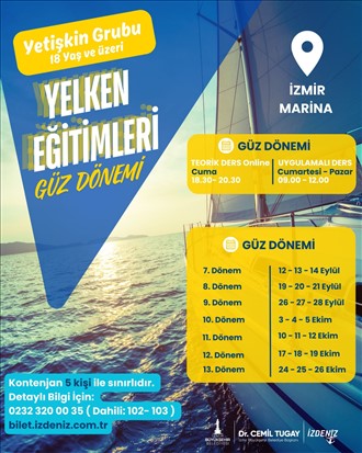 Cuma günleri online teorik, cumartesi ve pazar günleri ise İzmir Marina’da uygulamalı olarak gerçekleştirilecek eğitimlerde kontenjan 5 kişiyle sınırlı. 18 yaş ve üzeri katılımcılara açık olan eğitimlerin ücreti 6.000 TL olarak belirlendi. Kayıtlar bilet.izdeniz.com.tr adresinden yapılabiliyor. Ayrıntılı bilgi almak isteyenler için telefon numarası ise 0232 320 00 35 (Dahili 102–103).